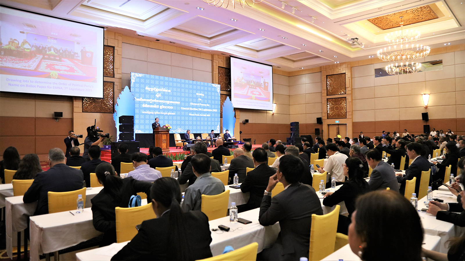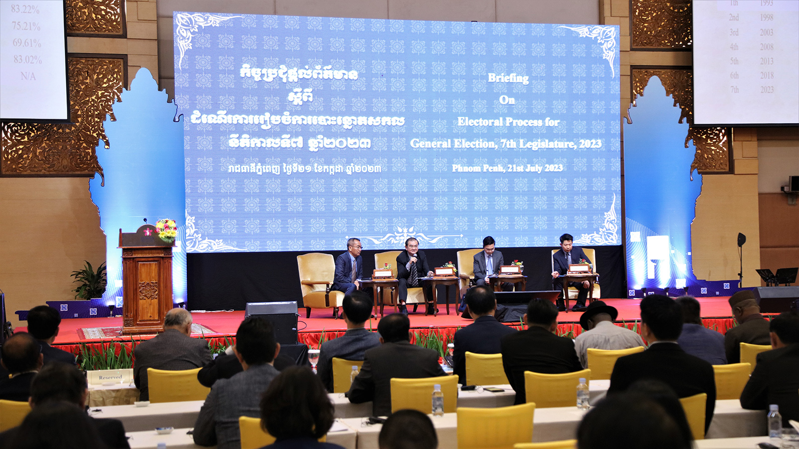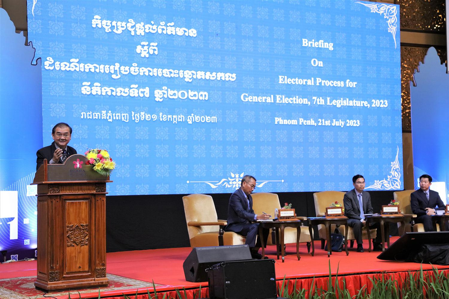 រូបភាពសកម្មភាព ឯកឧត្តម ឌឹម សុវណ្ណារុំ សមាជិក គ.ជ.ប និងជាប្រធានក្រុមប្រតិកម្មព័ត៌មាន គ.ជ.ប បានអញ្ជើញចូលរួមក្នុងកិច្ចប្រជុំផ្ដល់ព័ត៌មាន ស្ដីពីដំណើរការៀបចំការបោះឆ្នោតសកល នីតិកាលទី៧ ឆ្នាំ២០២៣ នារសៀលថ្ងៃទី២១ ខែកក្កដា ឆ្នាំ២០២៣ នៅសណ្ឋាគារសុខា អូតែល។