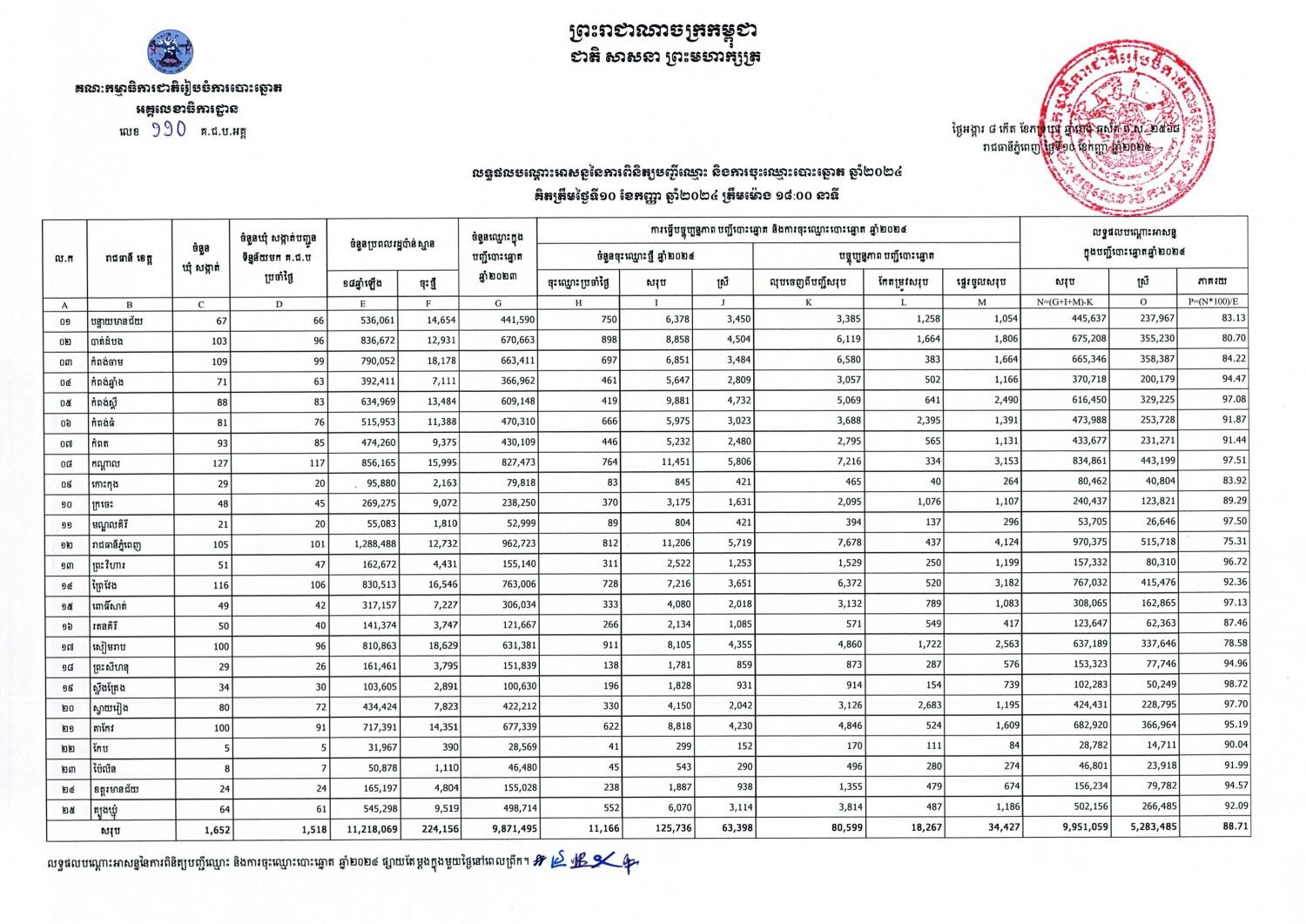 តារាងលទ្ធផលបណ្តោះអាសន្ននៃការពិនិត្យបញ្ជីឈ្មោះ និងការចុះឈ្មោះបោះឆ្នោត ឆ្នាំ២០២៤ គិតត្រឹមថ្ងៃទី១០ ខែកញ្ញា ឆ្នាំ២០២៤ ត្រឹមម៉ោង ១៨:០០ នាទី