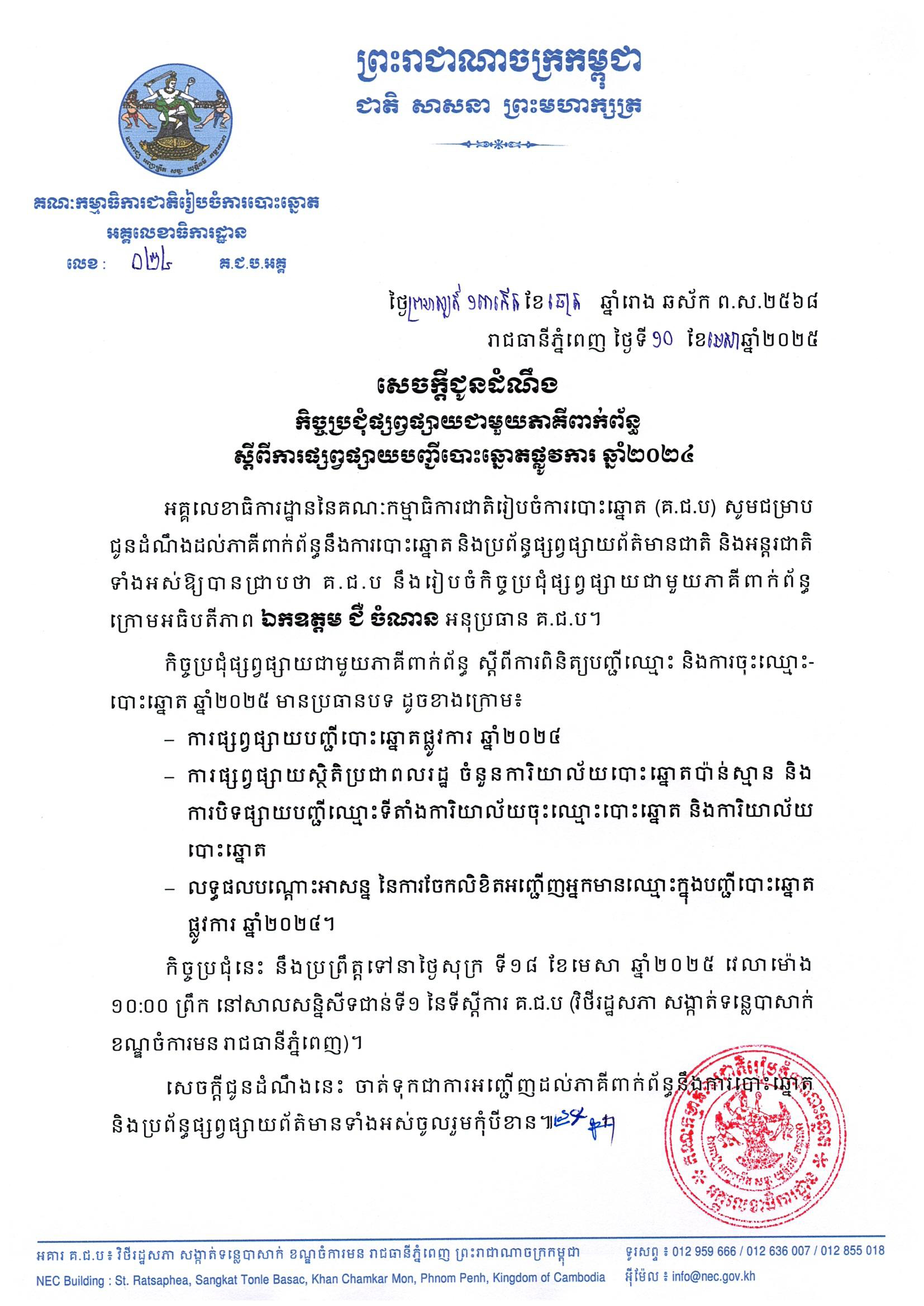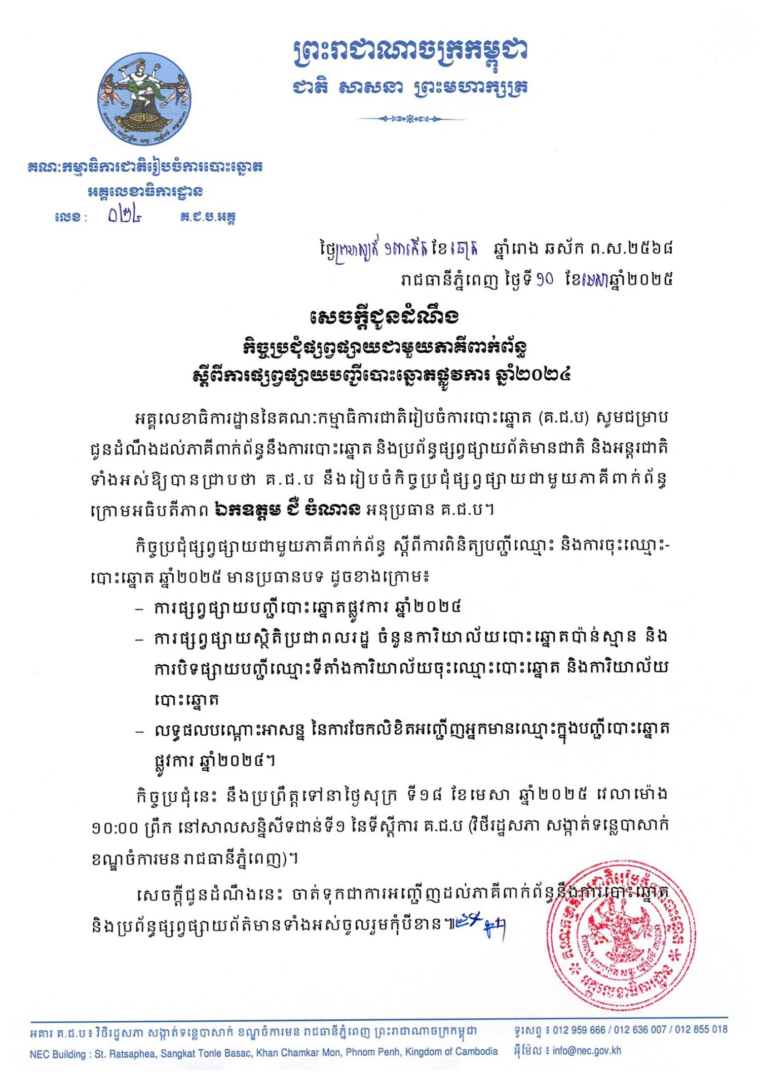 អគ្គលេខាធិការដ្ឋាននៃគណៈកម្មាធិការជាតិរៀបចំការបោះឆ្នោត (គ.ជ.ប) សូមជម្រាបជូនដំណឹងដល់ភាគីពាក់ព័ន្ធនឹងការបោះឆ្នោត និងប្រព័ន្ធផ្សព្វផ្សាយព័ត៌មានជាតិ និងអន្តរជាតិទាំងអស់ឱ្យបានជ្រាបថា គ.ជ.ប នឹងរៀបចំកិច្ចប្រជុំផ្សព្វផ្សាយជាមួយភាគីពាក់ព័ន្ធក្រោមអធិបតីភាពឯកឧត្តម ជឺ ចំណាន អនុប្រធាន គ.ជ.ប។