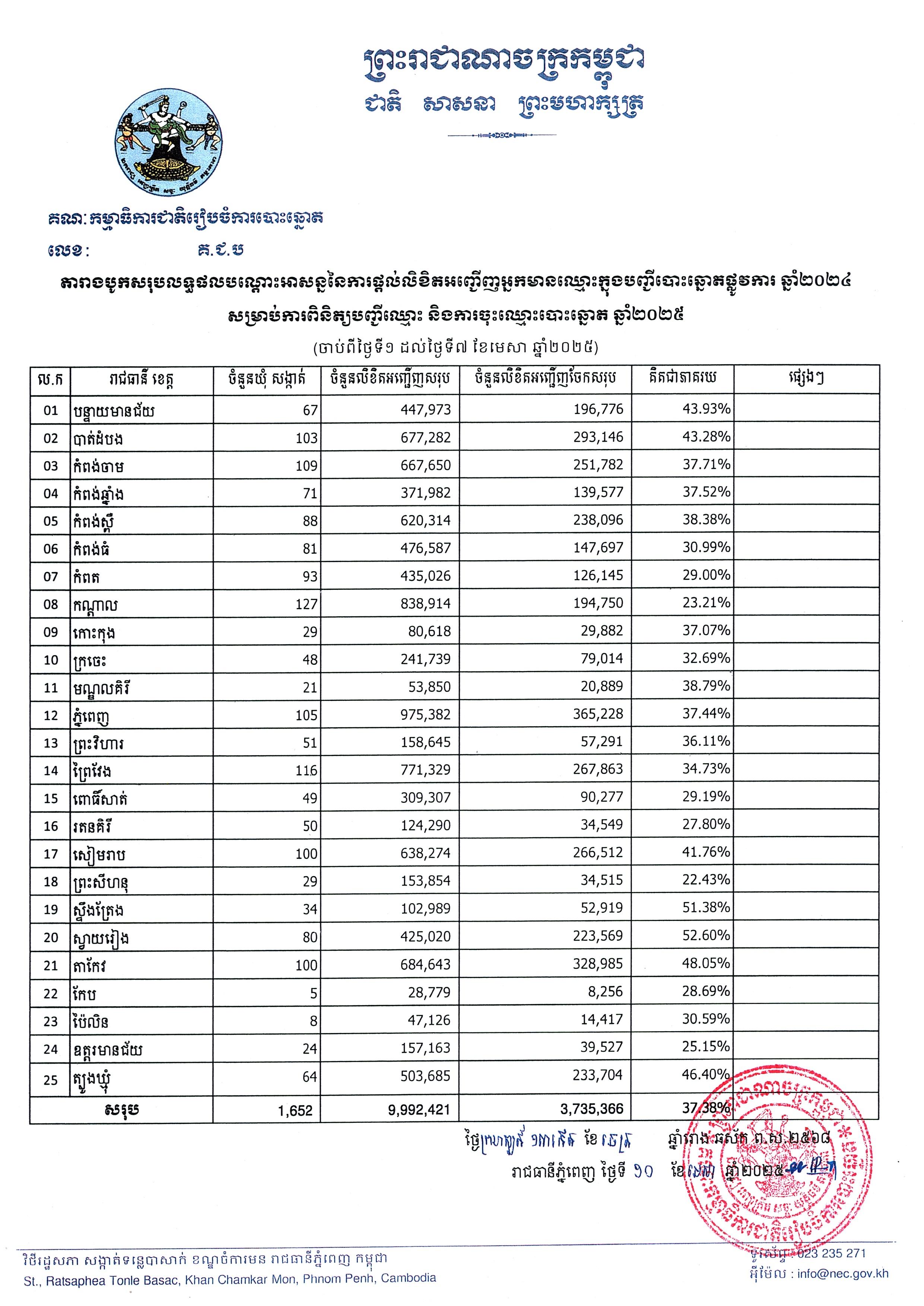 តារាងបូកសរុបលទ្ធផលបណ្តោះអាសន្ននៃការផ្តល់លិខិតអញ្ជើញអ្នកមានឈ្មោះក្នុងបញ្ជីបោះឆ្នោតផ្លូការ ឆ្នាំ២០២៤ សម្រាប់ការពិនិត្យបញ្ជីឈ្មោះ និងការចុះឈ្មោះបោះឆ្នោត ឆ្នាំ២០២៥ (ចាប់ពីថ្ងៃទី១ ដល់ថ្ងៃទី៧ ខែមេសា ឆ្នាំ២០២៥)