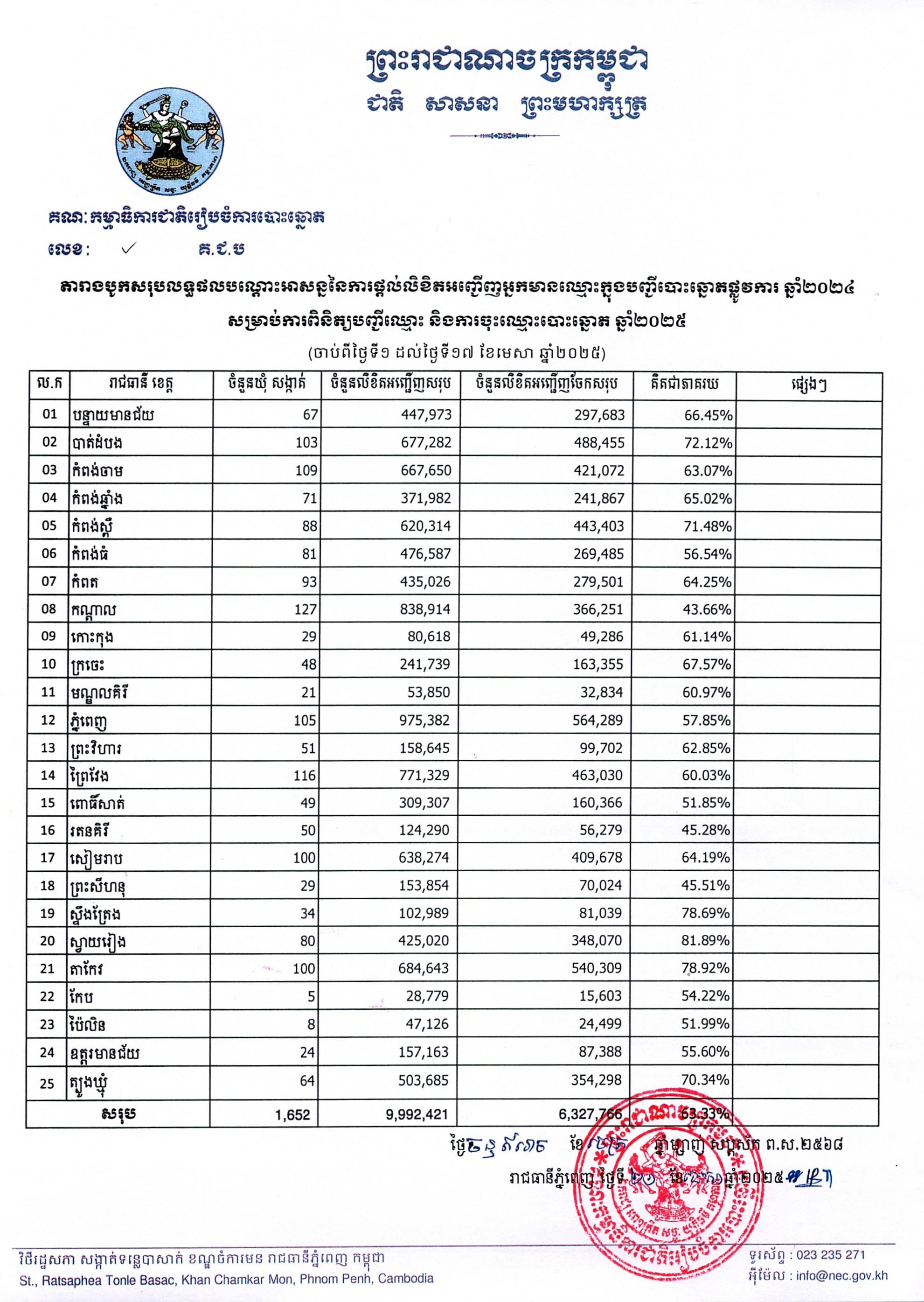 តារាងបូកសរុបលទ្ធផលបណ្តោះអាសន្ននៃការផ្តល់លិខិតអញ្ជើញអ្នកមានឈ្មោះក្នុងបញ្ជីបោះឆ្នោតផ្លូវការ ឆ្នាំ២០២៤ សម្រាប់ការពិនិត្យបញ្ជីឈ្មោះ និងការចុះឈ្មោះបោះឆ្នោត ឆ្នាំ២០២៥ (ចាប់ពីថ្ងៃទី១ ដល់ថ្ងៃទី១៧ ខែមេសា ឆ្នាំ២០២៥)