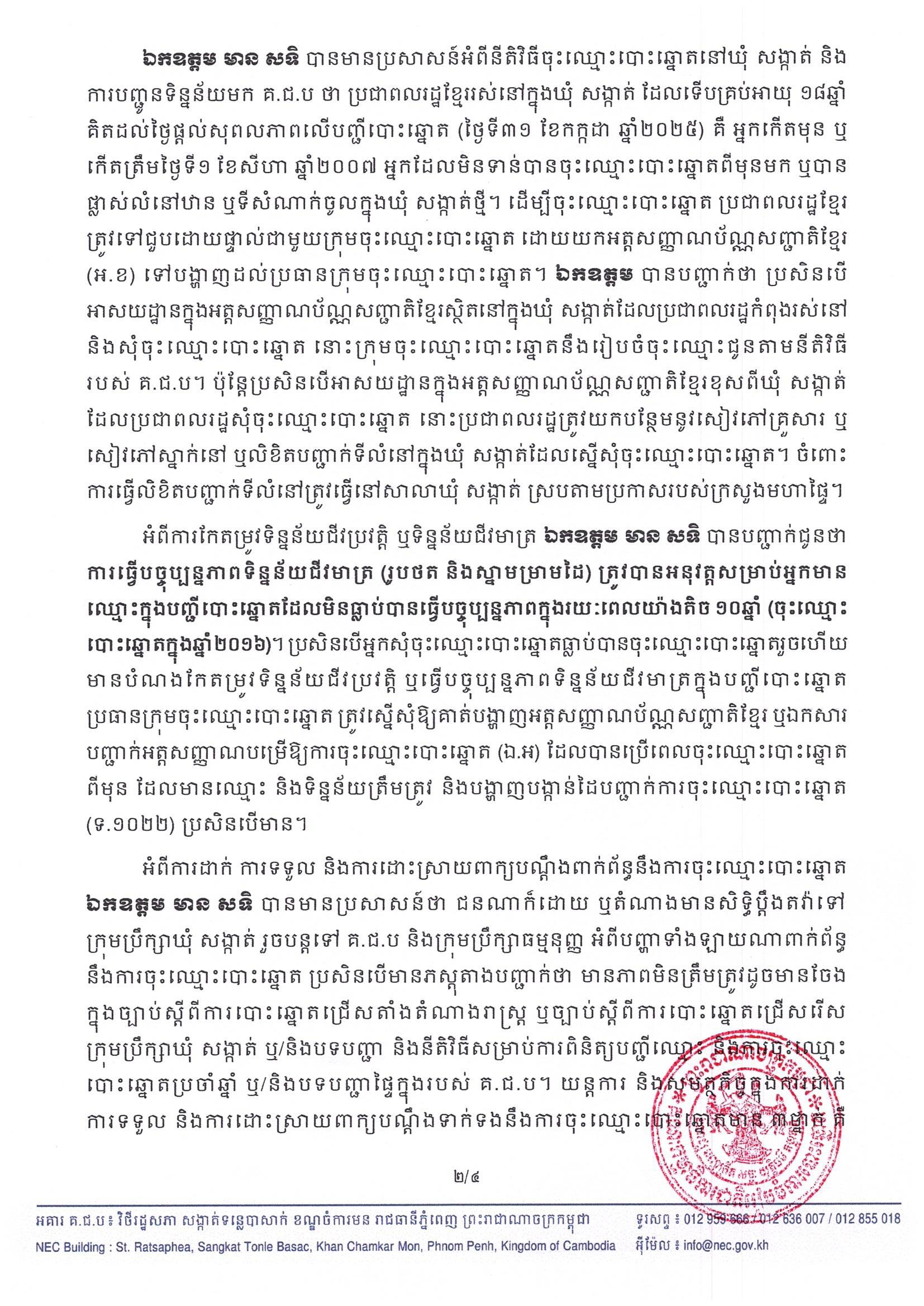 ឯកឧត្តម មាន សទិ បានមានប្រសាសន៍អំពីនីតិវិធីចុះឈ្មោះបោះឆ្នោតនៅឃុំ សង្កាត់ និង ការបញ្ជូនទិន្នន័យមក គ.ជ.ប ថា ប្រជាពលរដ្ឋខ្មែររស់នៅក្នុងឃុំ សង្កាត់ ដែលទើបគ្រប់អាយុ ១៨ឆ្នាំ គិតដល់ថ្ងៃផ្តល់សុពលភាពលើបញ្ជីបោះឆ្នោត (ថ្ងៃទី៣១ ខែកក្កដា ឆ្នាំ២០២៥) គឺ អ្នកកើតមុន ឬកើតត្រឹមថ្ងៃទី១ ខែសីហា ឆ្នាំ២០០៧ អ្នកដែលមិនទាន់បានចុះឈ្មោះបោះឆ្នោតពីមុនមក ឬបានផ្លាស់លំនៅឋាន ឬទីសំណាក់ចូលក្នុងឃុំ សង្កាត់ថ្មី។ ដើម្បីចុះឈ្មោះបោះឆ្នោត ប្រជាពលរដ្ឋខ្មែរ ត្រូវទៅជួបដោយផ្ទាល់ជាមួយក្រុមចុះឈ្មោះបោះឆ្នោត ដោយយកអត្តសញ្ញាណប័ណ្ណសញ្ជាតិខ្មែរ(អ.ខ) ទៅបង្ហាញដល់ប្រធានក្រុមចុះឈ្មោះបោះឆ្នោត។ ឯកឧត្តម បានបញ្ជាក់ថា ប្រសិនបើអាសយដ្ឋានក្នុងអត្តសញ្ញាណប័ណ្ណសញ្ជាតិខ្មែរស្ថិតនៅក្នុងឃុំ សង្កាត់ដែលប្រជាពលរដ្ឋកំពុងរស់នៅនិងសុំចុះឈ្មោះបោះឆ្នោត នោះក្រុមចុះឈ្មោះបោះឆ្នោតនឹងរៀបចំចុះឈ្មោះជូនតាមនីតិវិធីរបស់ គ.ជ.ប។ ប៉ុន្តែប្រសិនបើអាសយដ្ឋានក្នុងអត្តសញ្ញាណប័ណ្ណសញ្ជាតិខ្មែរខុសពីឃុំ សង្កាត់ ដែលប្រជាពលរដ្ឋសុំចុះឈ្មោះបោះឆ្នោត នោះប្រជាពលរដ្ឋត្រូវយកបន្ថែមនូវសៀវភៅគ្រួសារ ឬសៀវភៅស្នាក់នៅ ឬលិខិតបញ្ជាក់ទីលំនៅក្នុងឃុំ សងា្កត់ដែលស្នើសុំចុះឈ្មោះបោះឆ្នោត។ ចំពោះការធ្វើលិខិតបញ្ជាក់ទីលំនៅត្រូវធ្វើនៅសាលាឃុំ សង្កាត់ ស្របតាមប្រកាសរបស់ក្រសួងមហាផ្ទៃ។