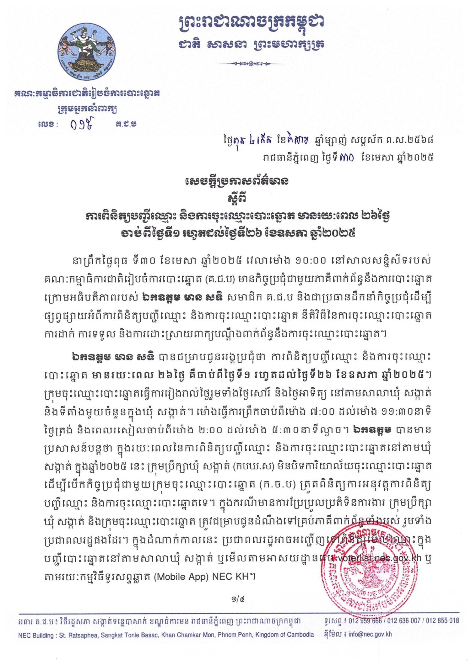 ឯកឧត្តម មាន សទិ បានជម្រាបជូនអង្គប្រជុំថា ការពិនិត្យបញ្ជីឈ្មោះ និងការចុះឈ្មោះ បោះឆ្នោត មានរយៈពេល ២៦ថ្ងៃ គឺចាប់ពីថ្ងៃទី១ រហូតដល់ថ្ងៃទី២៦ ខែឧសភា ឆ្នាំ២០២៥។ ក្រុមចុះឈ្មោះបោះឆ្នោតធ្វើការរៀងរាល់ថ្ងៃរួមទាំងថ្ងៃសៅរ៍ និងថ្ងៃអាទិត្យ នៅតាមសាលាឃុំ សង្កាត់ និងទីតាំងមួយចំនួនក្នុងឃុំ សង្កាត់។ ម៉ោងធ្វើការព្រឹកចាប់ពីម៉ោង ៧:០០ ដល់ម៉ោង ១១:៣០នាទីថ្ងៃត្រង់ និងពេលរសៀលចាប់ពីម៉ោង ២:០០ ដល់ម៉ោង ៥:៣០នាទីល្ងាច។ ឯកឧត្តម បានមានប្រសាសន៍បន្តថា ក្នុងរយៈពេលនៃការពិនិត្យបញ្ជីឈ្មោះ និងការចុះឈ្មោះបោះឆ្នោតនៅតាមឃុំ សង្កាត់ ក្នុងឆ្នាំ២០២៥ នេះ ក្រុមប្រឹក្សាឃុំ សង្កាត់ (កបឃ.ស) មិនបិទការិយាល័យចុះឈ្មោះបោះឆ្នោត ដើម្បីបើកកិច្ចប្រជុំជាមួយក្រុមចុះឈ្មោះបោះឆ្នោត (ក.ច.ប) ត្រួតពិនិត្យការអនុវត្តការពិនិត្យ បញ្ជីឈ្មោះ និងការចុះឈ្មោះបោះឆ្នោតទេ។ ក្នុងករណីមានការប្រែប្រួលប្រតិទិនការងារ ក្រុមប្រឹក្សា ឃុំ សង្កាត់ និងក្រុមចុះឈ្មោះបោះឆ្នោត ត្រូវជម្រាបជូនដំណឹងទៅគ្រប់ភាគីពាក់ព័ន្ធទាំងអស់ រួមទាំងប្រជាពលរដ្ឋផងដែរ។ ក្នុងដំណាក់កាលនេះ ប្រជាពលរដ្ឋអាចអញ្ជើញទៅពិនិត្យមើលឈ្មោះក្នុងបញ្ជីបោះឆ្នោតនៅតាមសាលាឃុំ សង្កាត់ ឬមើលតាមអាសយដ្ឋានវេប voterlist.nec.gov.kh ឬតាមរយៈកម្មវិធីទូរសព្ទឆ្លាត (Mobile App) NEC KH។
