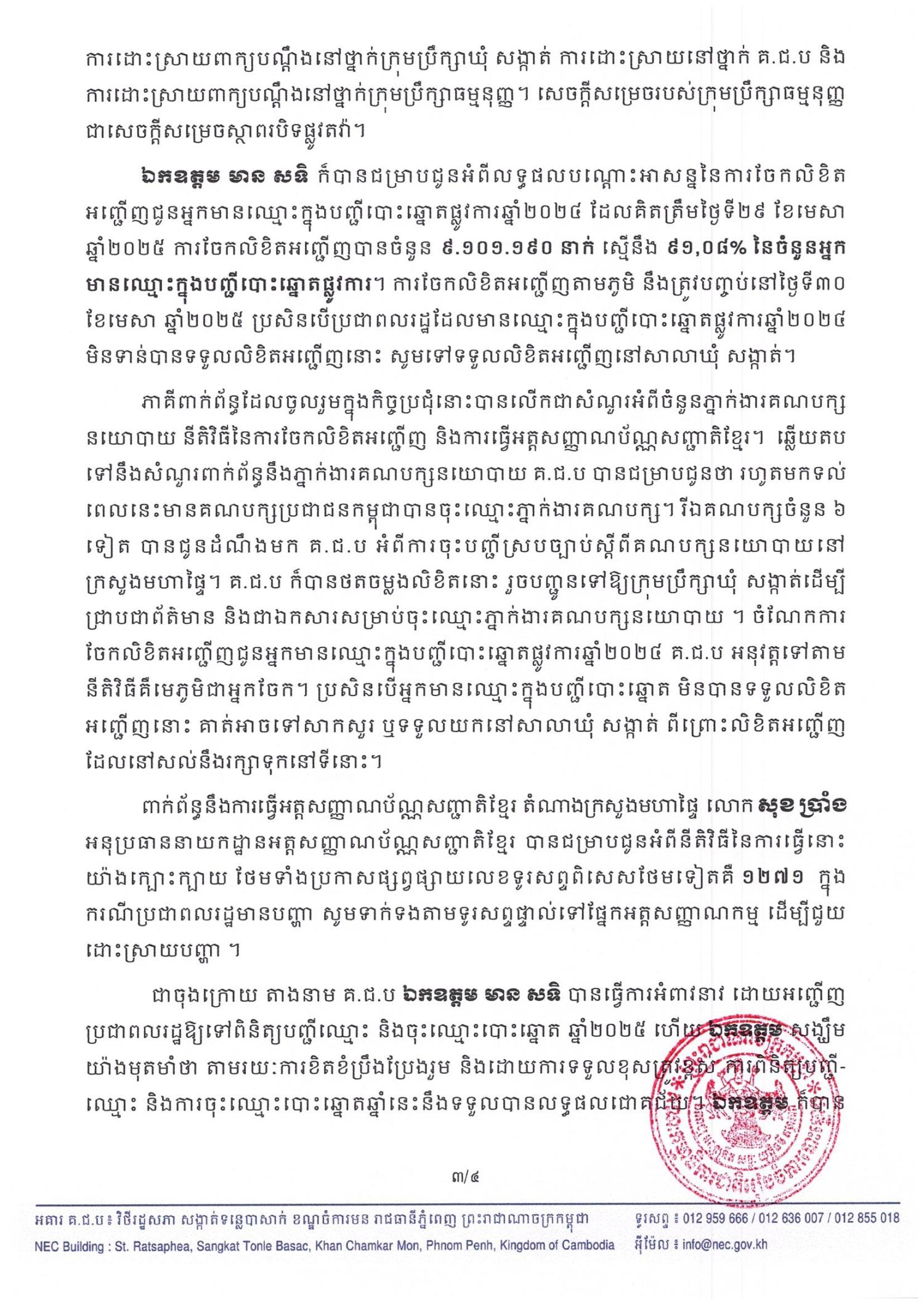ឯកឧត្តម មាន សទិ ក៏បានជម្រាបជូនអំពីលទ្ធផលបណ្តោះអាសន្ននៃការចែកលិខិតអញ្ជើញជូនអ្នកមានឈ្មោះក្នុងបញ្ជីបោះឆ្នោតផ្លូវការឆ្នាំ២០២៤ ដែលគិតត្រឹមថ្ងៃទី២៩ ខែមេសា ឆ្នាំ២០២៥ ការចែកលិខិតអញ្ជើញបានចំនួន ៩.១០១.១៩០ នាក់ ស្មើនឹង ៩១,០៨% នៃចំនួនអ្នកមានឈ្មោះក្នុងបញ្ជីបោះឆ្នោតផ្លូវការ។ ការចែកលិខិតអញ្ជើញតាមភូមិ នឹងត្រូវបញ្ចប់នៅថ្ងៃទី៣០ ខែមេសា ឆ្នាំ២០២៥ ប្រសិនបើប្រជាពលរដ្ឋដែលមានឈ្មោះក្នុងបញ្ជីបោះឆ្នោតផ្លូវការឆ្នាំ២០២៤ មិនទាន់បានទទួលលិខិតអញ្ជើញនោះ សូមទៅទទួលលិខិតអញ្ជើញនៅសាលាឃុំ សង្កាត់។