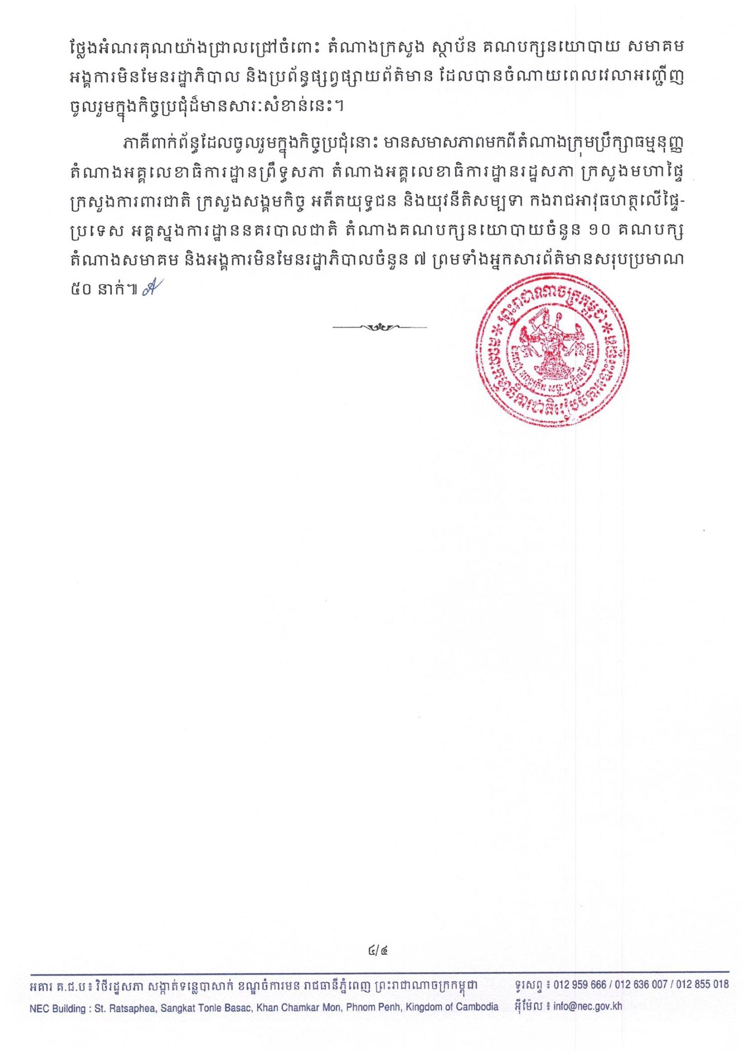 នាព្រឹកថ្ងៃពុធ ទី៣០ ខែមេសា ឆ្នាំ២០២៥ វេលាម៉ោង ១០:០០ នៅសាលសន្និសីទរបស់ គណៈកម្មាធិការជាតិរៀបចំការបោះឆ្នោត (គ.ជ.ប) មានកិច្ចប្រជុំជាមួយភាគីពាក់ព័ន្ធនឹងការបោះឆ្នោត ក្រោមអធិបតីភាពរបស់ ឯកឧត្តម មាន សទិ សមាជិក គ.ជ.ប និងជាប្រធានដឹកនាំកិច្ចប្រជុំដើម្បីផ្សព្វផ្សាយអំពីការពិនិត្យបញ្ជីឈ្មោះ និងការចុះឈ្មោះបោះឆ្នោត នីតិវិធីនៃការចុះឈ្មោះបោះឆ្នោត ការដាក់ ការទទួល និងការដោះស្រាយពាក្យបណ្តឹងពាក់ព័ន្ធនឹងការចុះឈ្មោះបោះឆ្នោត។