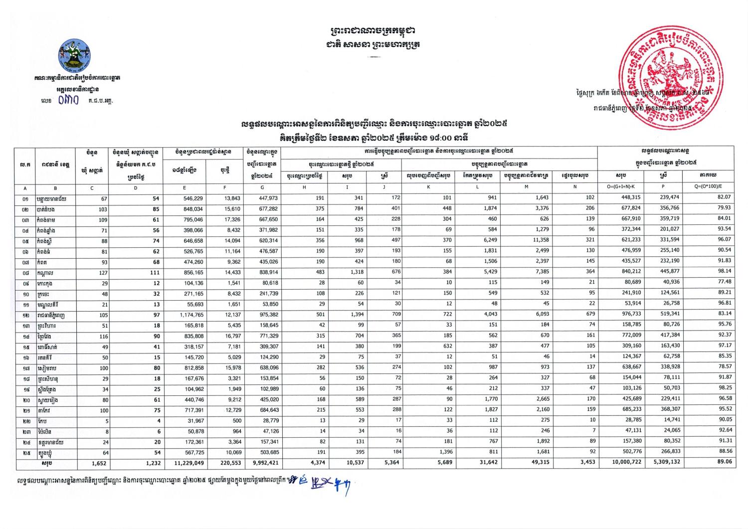 លទ្ធផលបណ្តោះអាសន្ននៃការពិនិត្យបញ្ជីឈ្មោះ និងការចុះឈ្មោះបោះឆ្នោត ឆ្នាំ២០២៥ គិតត្រឹមថ្ងៃទី២ ខែឧសភា ឆ្នាំ២០២៥