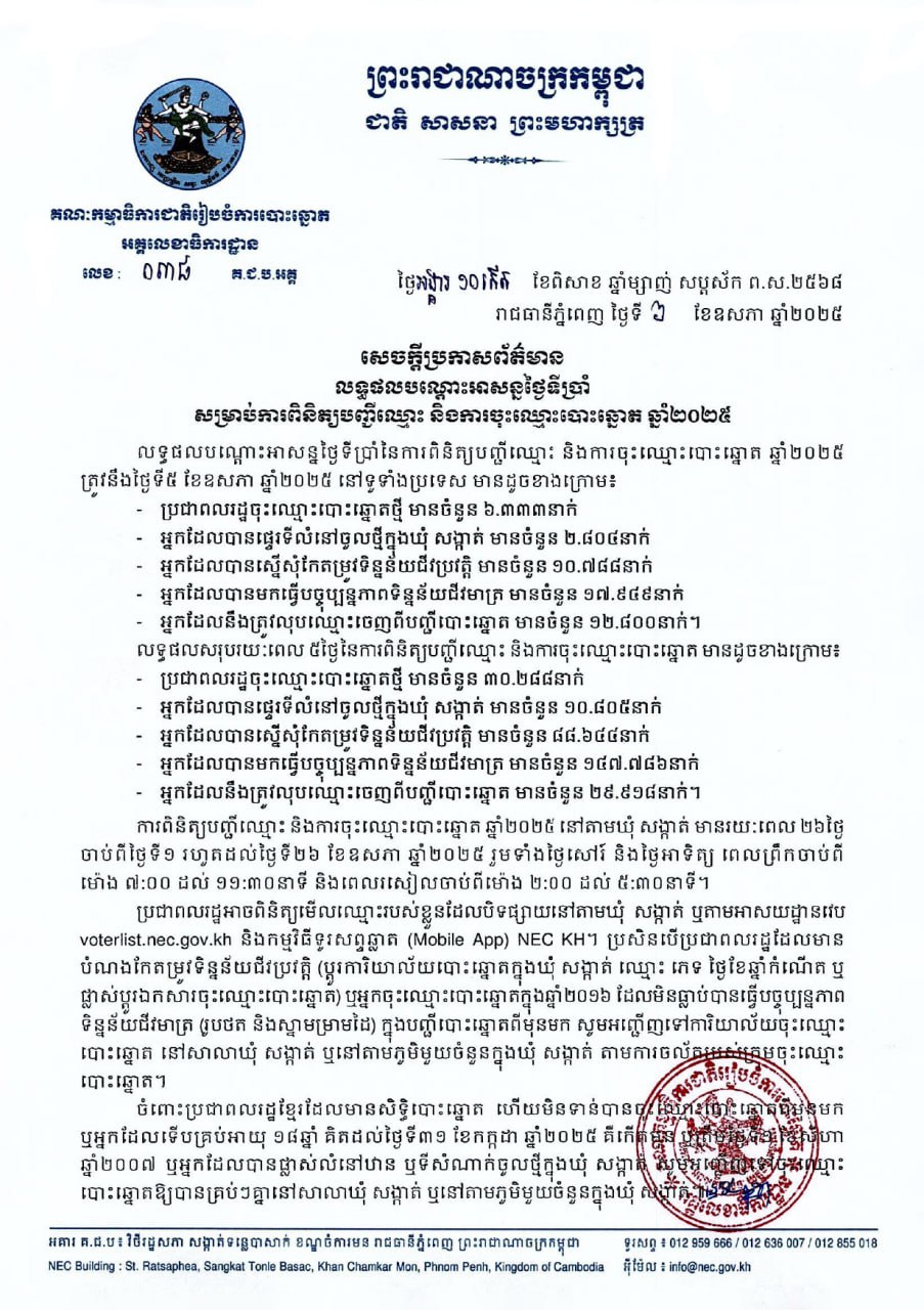 លទ្ធផលបណ្ដោះអាសន្នថ្ងៃទីប្រាំនៃការពិនិត្យបញ្ជីឈ្មោះ និងការចុះឈ្មោះបោះឆ្នោត ឆ្នាំ២០២៥ ត្រូវនឹងថ្ងៃទី៥ ខែឧសភា ឆ្នាំ២០២៥ នៅទូទាំងប្រទេស មានដូចខាងក្រោម៖