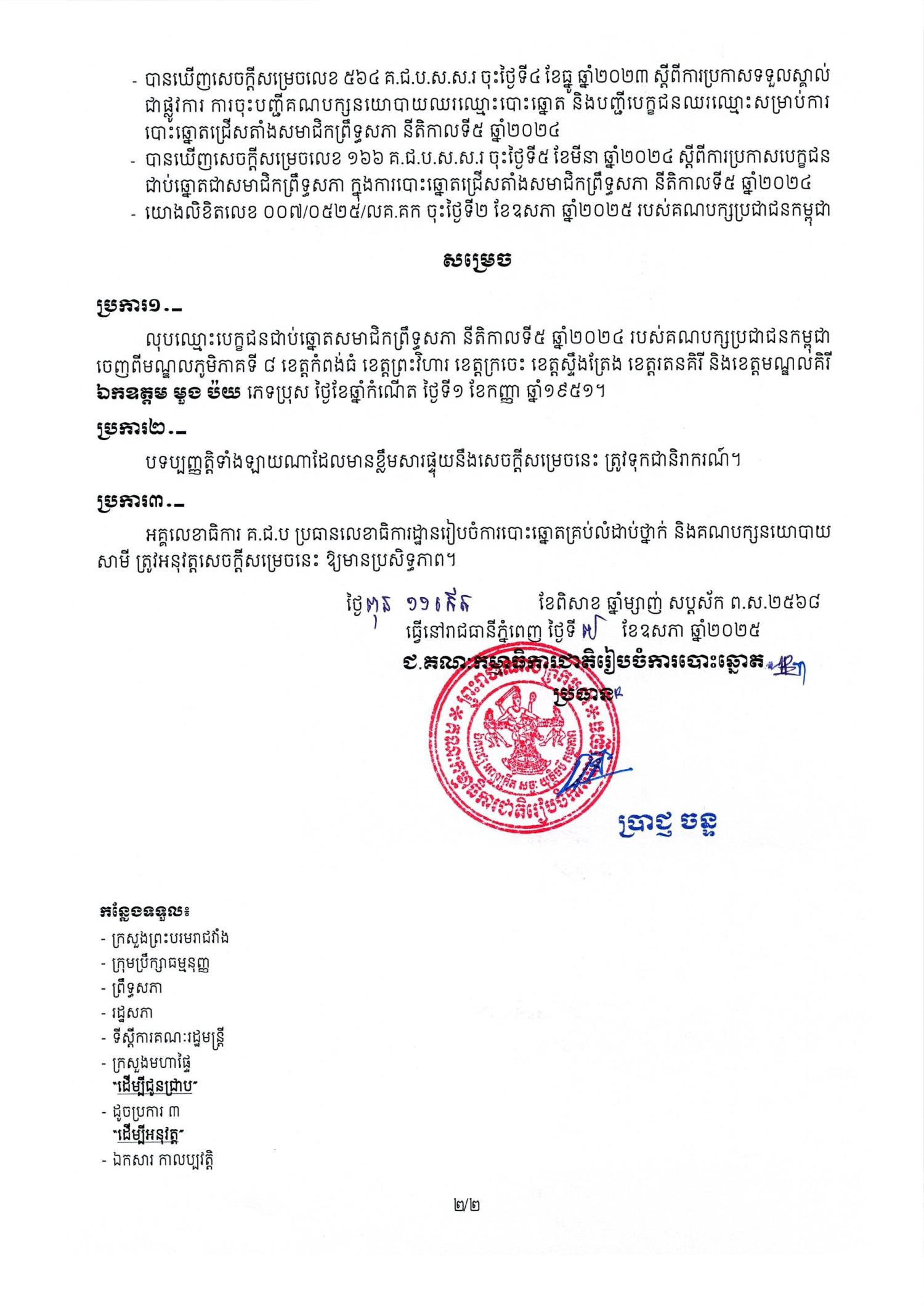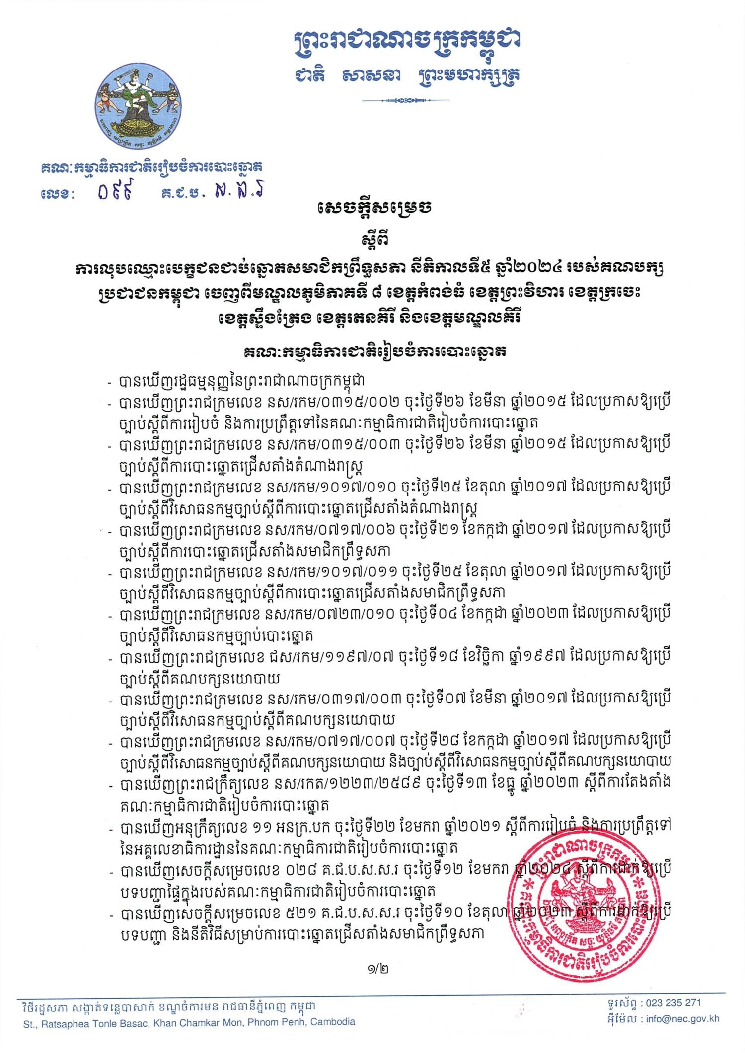សេចក្តីសម្រេចលេខ ០៩៩ គ.ជ.ប.ស.ស.រ ស្តីពីការលុបឈ្មោះបេក្ខជនជាប់ឆ្នោតសមាជិកព្រឹទ្ធសភា នីតិកាលទី៥ ឆ្នាំ២០២៤ របស់គណបក្ស ប្រជាជនកម្ពុជា ចេញពីមណ្ឌលភូមិភាគទី ៨ ខេត្តកំពង់ធំ ខេត្តព្រះវិហារ ខេត្តក្រចេះ ខេត្តស្ទឹងត្រែង ខេត្តរតនគិរី និងខេត្តមណ្ឌលគិរី