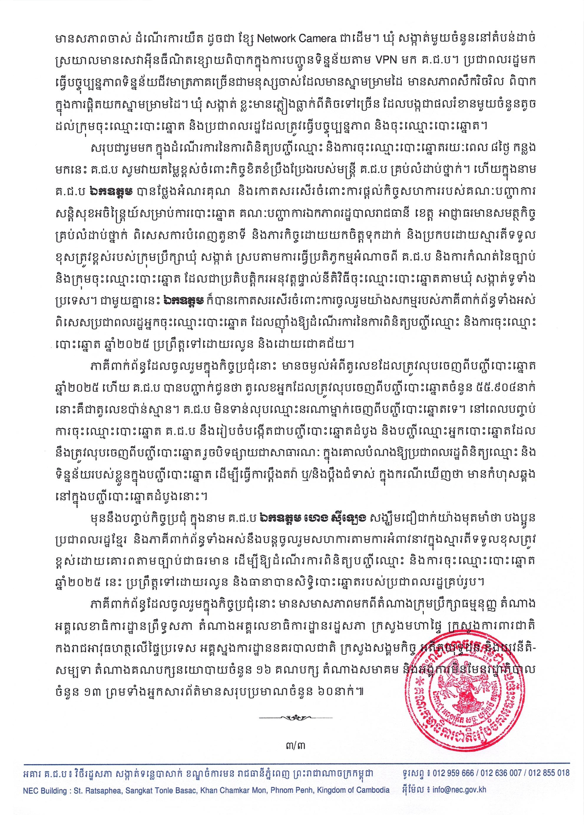 សរុបជារួមមក ក្នុងដំណើរការនៃការពិនិត្យបញ្ជីឈ្មោះ និងការចុះឈ្មោះបោះឆ្នោតរយៈពេល ៨ថ្ងៃ កន្លងមកនេះ គ.ជ.ប សូមវាយតម្លៃខ្ពស់ចំពោះកិច្ចខិតខំប្រឹងប្រែងរបស់មន្ត្រី គ.ជ.ប គ្រប់លំដាប់ថ្នាក់។ ហើយក្នុងនាម គ.ជ.ប ឯកឧត្តម បានថ្លែងអំណរគុណ និងកោតសរសើរចំពោះការផ្តល់កិច្ចសហការរបស់គណៈបញ្ជាការសន្តិសុខអចិន្ត្រៃយ៍សម្រាប់ការបោះឆ្នោត គណៈបញ្ជាការឯកភាពរដ្ឋបាលរាជធានី ខេត្ត អាជ្ញាធរមានសមត្ថកិច្ចគ្រប់លំដាប់ថ្នាក់ ពិសេសការបំពេញតួនាទី និងភារកិច្ចដោយយកចិត្តទុកដាក់ និងប្រកបដោយស្មារតីទទួលខុសត្រូវខ្ពស់របស់ក្រុមប្រឹក្សាឃុំ សង្កាត់ ស្របតាមការធ្វើប្រតិភូកម្មអំណាចពី គ.ជ.ប និងការកំណត់នៃច្បាប់ និងក្រុមចុះឈ្មោះបោះឆ្នោត ដែលជាប្រតិបត្តិករអនុវត្តផ្ទាល់នីតិវិធីចុះឈ្មោះបោះឆ្នោតតាមឃុំ សង្កាត់ទូទាំងប្រទេស។ ជាមួយគ្នានេះ ឯកឧត្តម ក៏បានកោតសរសើរចំពោះការចូលរួមយ៉ាងសកម្មរបស់ភាគីពាក់ព័ន្ធទាំងអស់ ពិសេសប្រជាពលរដ្ឋអ្នកចុះឈ្មោះបោះឆ្នោត ដែលញ៉ាំងឱ្យដំណើរការនៃការពិនិត្យបញ្ជីឈ្មោះ និងការចុះឈ្មោះបោះឆ្នោត ឆ្នាំ២០២៥ ប្រព្រឹត្តទៅដោយរលូន និងដោយជោគជ័យ។