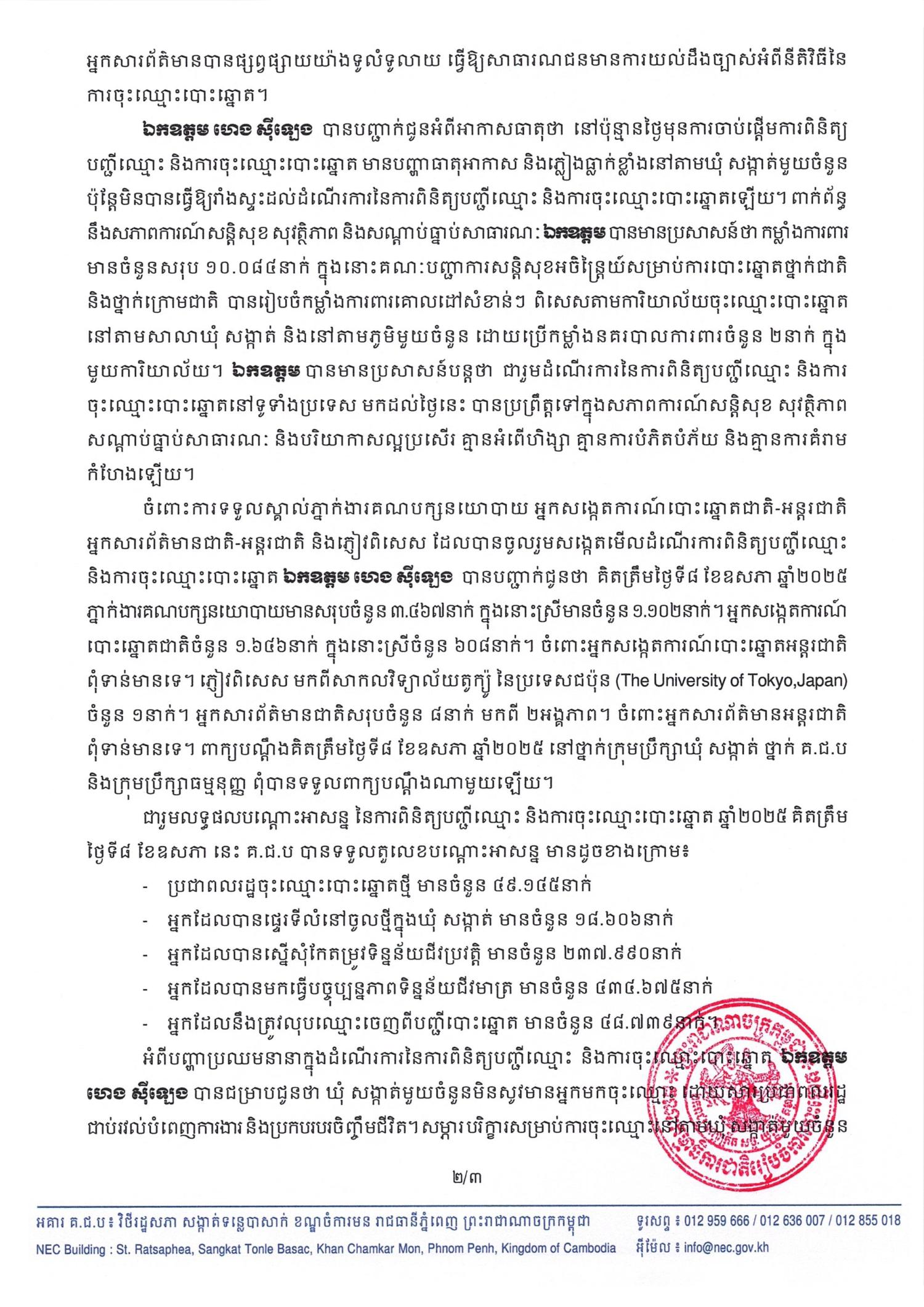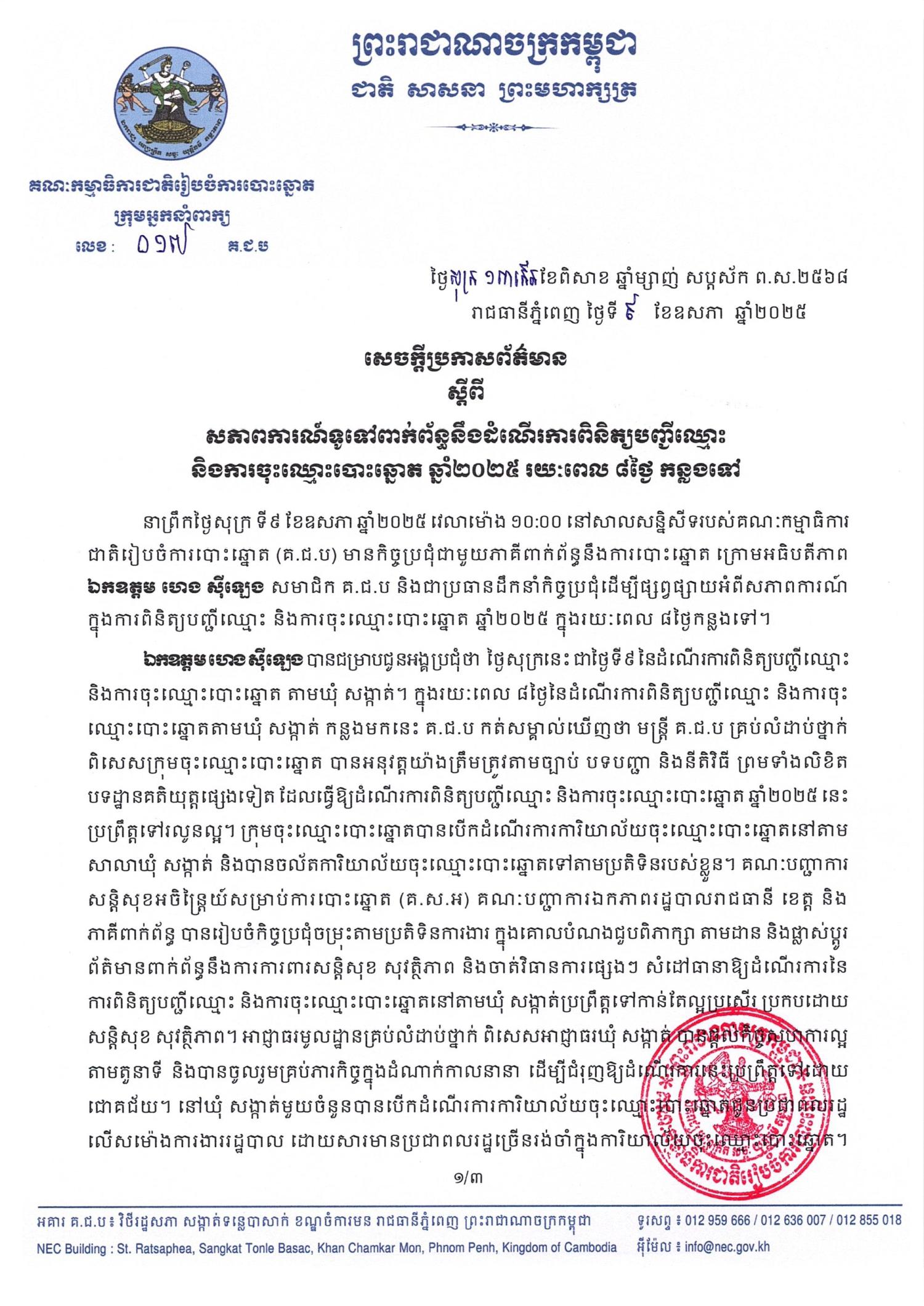 ឯកឧត្តម ហេង ស៊ីឡេង បានជម្រាបជូនអង្គប្រជុំថា ថ្ងៃសុក្រនេះ ជាថ្ងៃទី៩ នៃដំណើរការពិនិត្យបញ្ជីឈ្មោះ និងការចុះឈ្មោះបោះឆ្នោត តាមឃុំ សង្កាត់។ ក្នុងរយៈពេល ៨ថ្ងៃនៃដំណើរការពិនិត្យបញ្ជីឈ្មោះ និងការចុះឈ្មោះបោះឆ្នោតតាមឃុំ សង្កាត់ កន្លងមកនេះ គ.ជ.ប កត់សម្គាល់ឃើញថា មន្ត្រី គ.ជ.ប គ្រប់លំដាប់ថ្នាក់ ពិសេសក្រុមចុះឈ្មោះបោះឆ្នោត បានអនុវត្តយ៉ាងត្រឹមត្រូវតាមច្បាប់ បទបញ្ជា និងនីតិវិធី ព្រមទាំងលិខិតបទដ្ឋានគតិយុត្តផ្សេងទៀត ដែលធ្វើឱ្យដំណើរការពិនិត្យបញ្ជីឈ្មោះ និងការចុះឈ្មោះបោះឆ្នោត ឆ្នាំ២០២៥ នេះ ប្រព្រឹត្តទៅរលូនល្អ។ ក្រុមចុះឈ្មោះបោះឆ្នោតបានបើកដំណើរការការិយាល័យចុះឈ្មោះបោះឆ្នោតនៅតាមសាលាឃុំ សង្កាត់ និងបានចល័តការិយាល័យចុះឈ្មោះបោះឆ្នោតទៅតាមប្រតិទិនរបស់ខ្លួន។ គណៈបញ្ជាការសន្តិសុខអចិន្ត្រៃយ៍សម្រាប់ការបោះឆ្នោត (គ.ស.អ) គណៈបញ្ជាការឯកភាពរដ្ឋបាលរាជធានី ខេត្ត និងភាគីពាក់ព័ន្ធ បានរៀបចំកិច្ចប្រជុំចម្រុះតាមប្រតិទិនការងារ ក្នុងគោលបំណងជួបពិភាក្សា តាមដាន និងផ្លាស់ប្តូរព័ត៌មានពាក់ព័ន្ធនឹងការការពារសន្តិសុខ សុវត្ថិភាព និងចាត់វិធានការផ្សេងៗ សំដៅធានាឱ្យដំណើរការនៃការពិនិត្យបញ្ជីឈ្មោះ និងការចុះឈ្មោះបោះឆ្នោតនៅតាមឃុំ សង្កាត់ប្រព្រឹត្តទៅកាន់តែល្អប្រសើរ ប្រកបដោយសន្តិសុខ សុវត្ថិភាព។ អាជ្ញាធរមូលដ្ឋានគ្រប់លំដាប់ថ្នាក់ ពិសេសអាជ្ញាធរឃុំ សង្កាត់ បានផ្តល់កិច្ចសហការល្អតាមតួនាទី និងបានចូលរួមគ្រប់ភារកិច្ចក្នុងដំណាក់កាលនានា ដើម្បីជំរុញឱ្យដំណើរការនេះប្រព្រឹត្តទៅដោយជោគជ័យ។ នៅឃុំ សង្កាត់មួយចំនួនបានបើកដំណើរការការិយាល័យចុះឈ្មោះបោះឆ្នោតជូនប្រជាពលរដ្ឋលើសម៉ោងការងាររដ្ឋបាល ដោយសារមានប្រជាពលរដ្ឋច្រើនរង់ចាំក្នុងការិយាល័យចុះឈ្មោះបោះឆ្នោត។ អ្នកសារព័ត៌មានបានផ្សព្វផ្សាយយ៉ាងទូលំទូលាយ ធ្វើឱ្យសាធារណជនមានការយល់ដឹងច្បាស់អំពីនីតិវិធីនៃការចុះឈ្មោះបោះឆ្នោត។