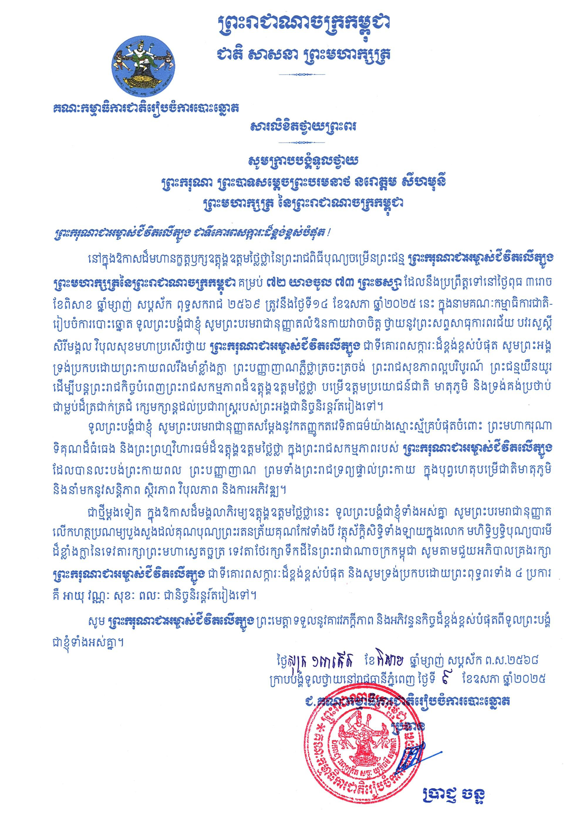 សារលិខិតថ្វាយព្រះពររបស់ ឯកឧត្តម ប្រាជ្ញ ចន្ទ ប្រធានគណៈកម្មាធិការជាតិរៀបចំការបោះឆ្នោត ក្រាបបង្គំទូលថ្វាយ ព្រះករុណា ព្រះបាទសម្តេចព្រះបរមនាថ នរោត្តម សីហមុនី ព្រះមហាក្សត្រនៃព្រះរាជាណាចក្រកម្ពុជា ក្នុងឱកាសដ៏មហានក្ខត្តឫក្សឧត្តុង្គឧត្តមថ្លៃថ្លានៃព្រះរាជពិធីបុណ្យចម្រើនព្រះជន្ម ព្រះករុណាជាអម្ចាស់ជីវិតលើត្បូង ព្រះមហាក្សត្រនៃព្រះរាជាណាចក្រកម្ពុជា គម្រប់ ៧២ យាងចូល ៧៣ ព្រះវស្សា