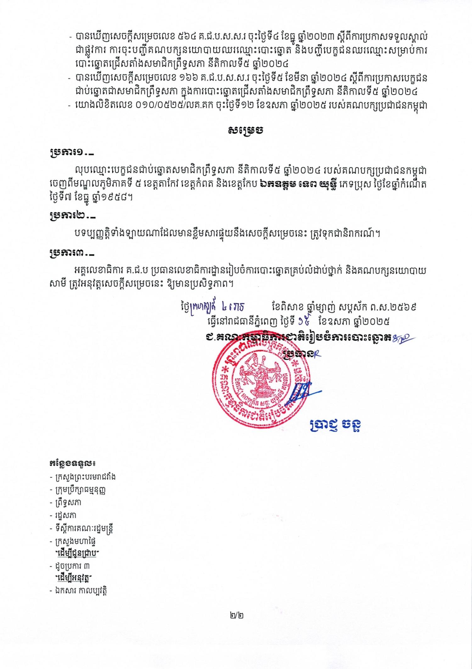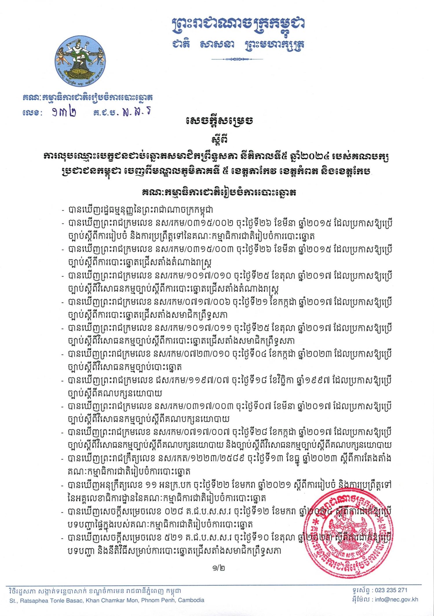 សេចក្តីសម្រេចលេខ ១៣២ គ.ជ.ប.ស.ស.រ ស្តីពីការលុបឈ្មោះបេក្ខជនជាប់ឆ្នោតសមាជិកព្រឹទ្ធសភា នីតិកាលទី៥ ឆ្នាំ២០២៤ របស់គណបក្សប្រជាជនកម្ពុជា ចេញពីមណ្ឌលភូមិភាគទី ៥ ខេត្តតាកែវ ខេត្តកំពត និងខេត្តកែប
