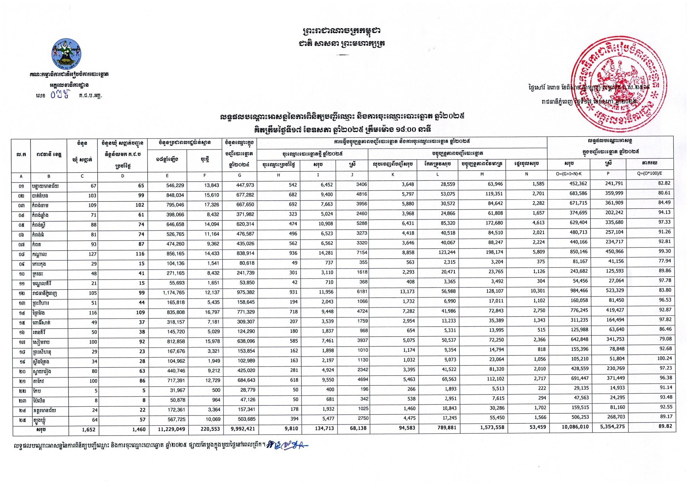 លទ្ធផលបណ្ដោះអាសន្ននៃការពិនិត្យបញ្ជីឈ្មោះ និងការចុះឈ្មោះបោះឆ្នោត ឆ្នាំ២០២៥ គិតត្រឹមថ្ងៃទី១៧ ខែឧសភា ឆ្នាំ២០២៥