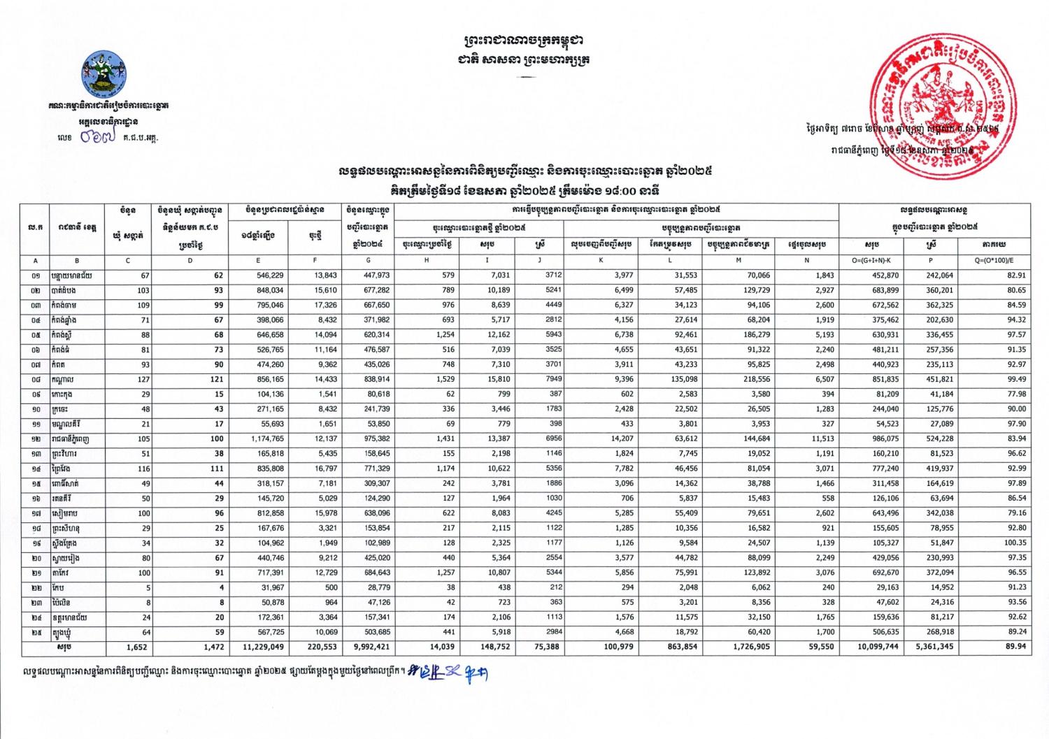 លទ្ធផលបណ្ដោះអាសន្ននៃការពិនិត្យបញ្ជីឈ្មោះ និងការចុះឈ្មោះបោះឆ្នោត ឆ្នាំ២០២៥ គិតត្រឹមថ្ងៃទី១៨ ខែឧសភា ឆ្នាំ២០២៥