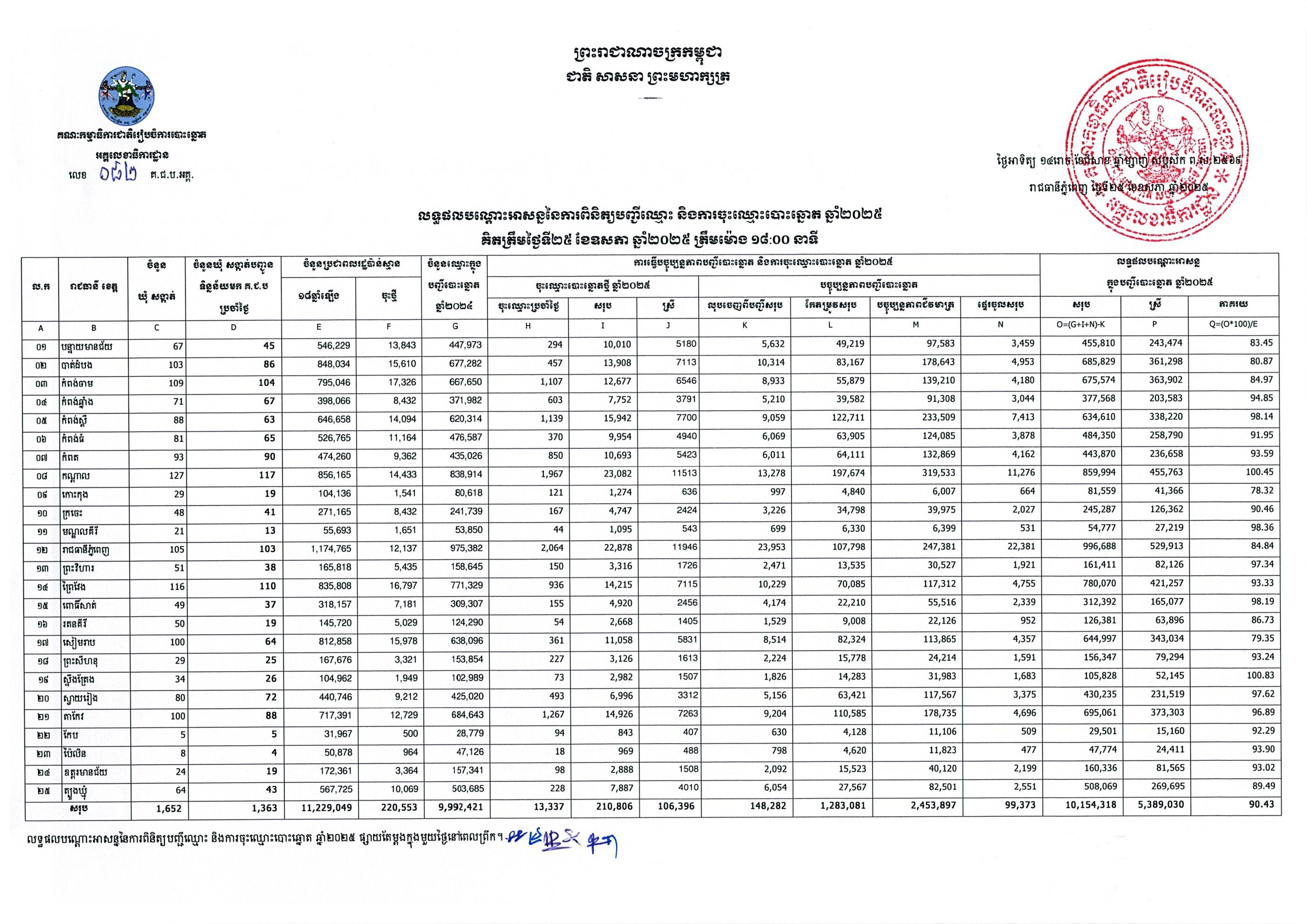 លទ្ធផលបណ្ដោះអាសន្ននៃការពិនិត្យបញ្ជីឈ្មោះ និងការចុះឈ្មោះបោះឆ្នោត ឆ្នាំ២០២៥ គិតត្រឹមថ្ងៃទី២៥ ខែឧសភា ឆ្នាំ២០២៥