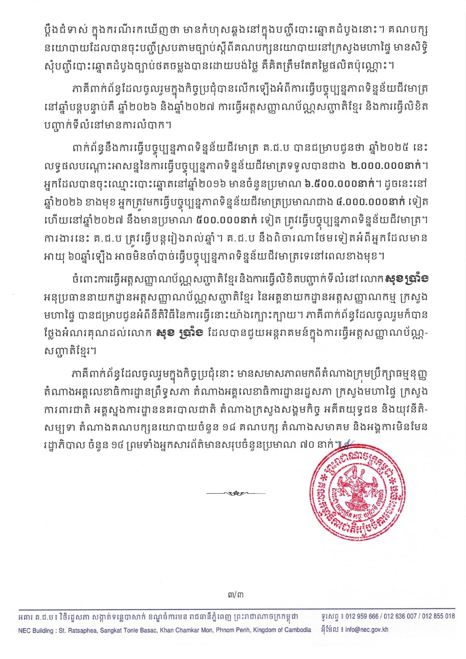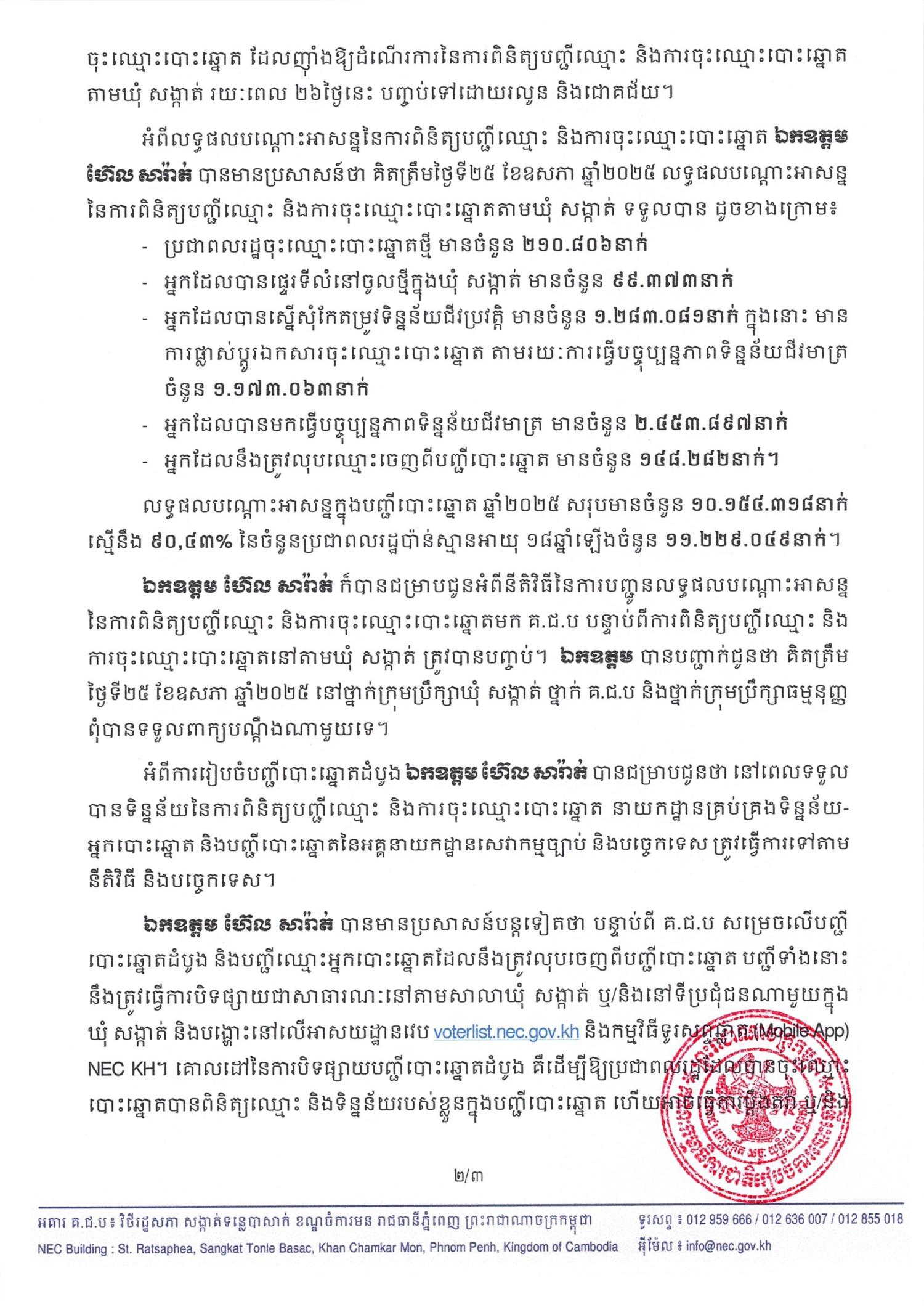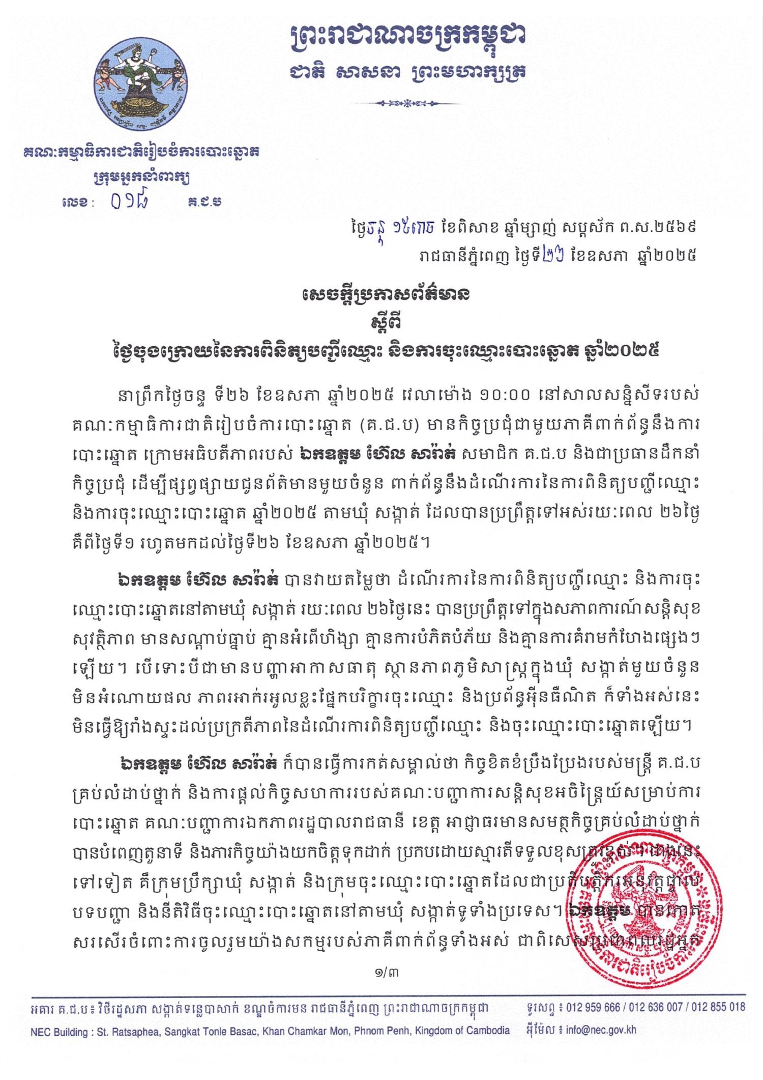 សេចក្តីប្រកាសព័ត៌មានរបស់អ្នកនាំពាក្យលេខ ០១៨ គ.ជ.ប ស្តីពីថ្ងៃចុងក្រោយនៃការពិនិត្យបញ្ជីឈ្មោះ និងការចុះឈ្មោះបោះឆ្នោត ឆ្នាំ២០២៥