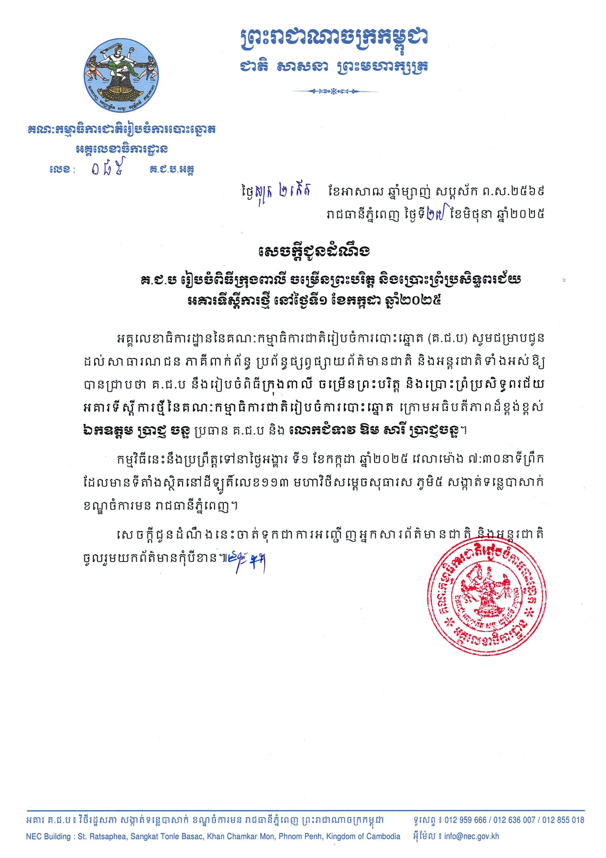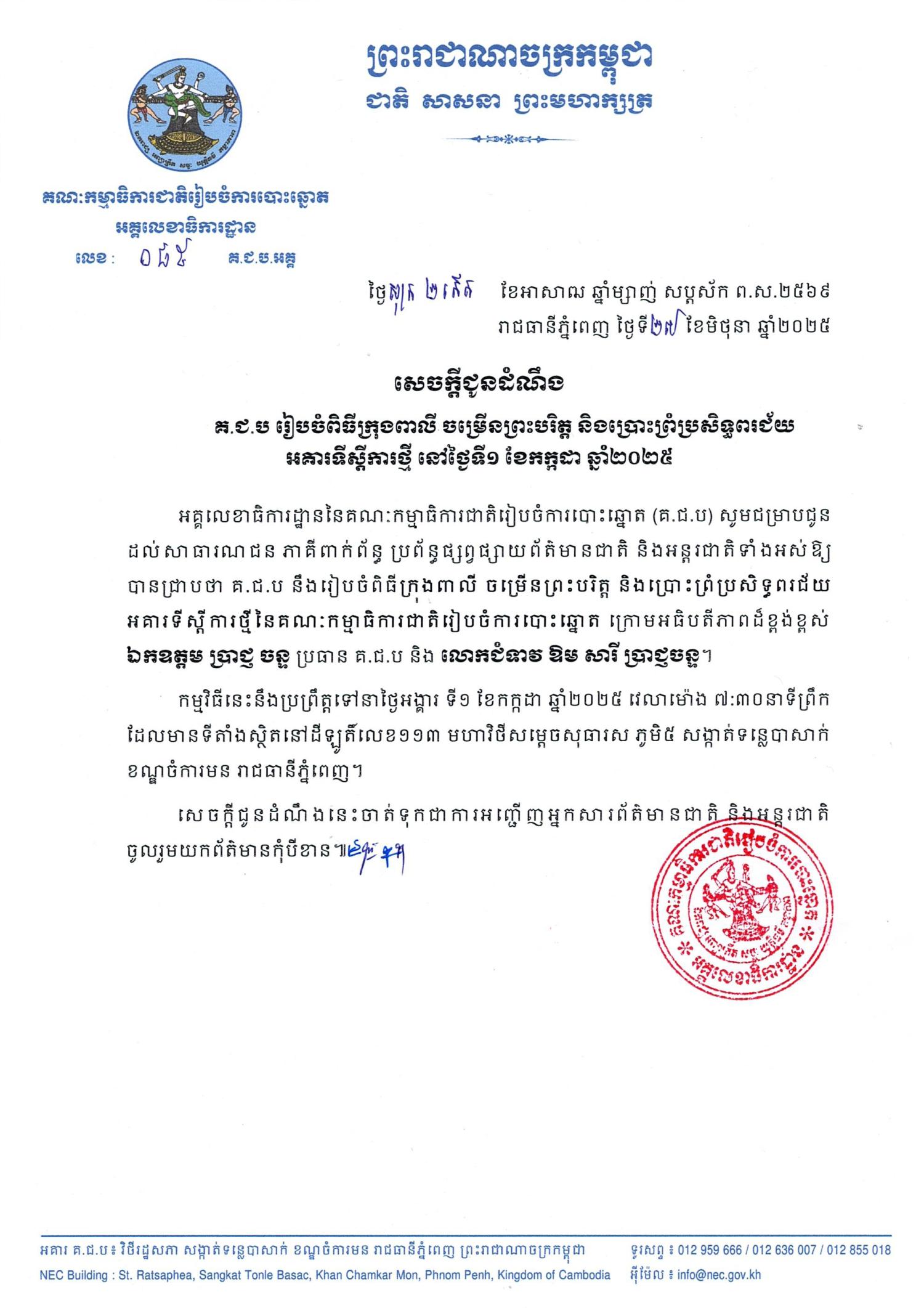 អគ្គលេខាធិការដ្ឋាននៃគណៈកម្មាធិការជាតិរៀបចំការបោះឆ្នោត (គ.ជ.ប) សូមជម្រាបជូនដល់សាធារណជន ភាគីពាក់ព័ន្ធ ប្រព័ន្ធផ្សព្វផ្សាយព័ត៌មានជាតិ និងអន្តរជាតិទាំងអស់ឱ្យបានជ្រាបថា គ.ជ.ប នឹងរៀបចំពិធីក្រុងពាលី ចម្រើនព្រះបរិត្ត និងប្រោះព្រំប្រសិទ្ធពរជ័យ អគារទីស្ដីការថ្មីនៃគណៈកម្មាធិការជាតិរៀបចំការបោះឆ្នោត ក្រោមអធិបតីភាពដ៏ខ្ពង់ខ្ពស់ ឯកឧត្តម ប្រាជ្ញ ចន្ទ ប្រធាន គ.ជ.ប និង លោកជំទាវ ឱម សារី ប្រាជ្ញចន្ទ។