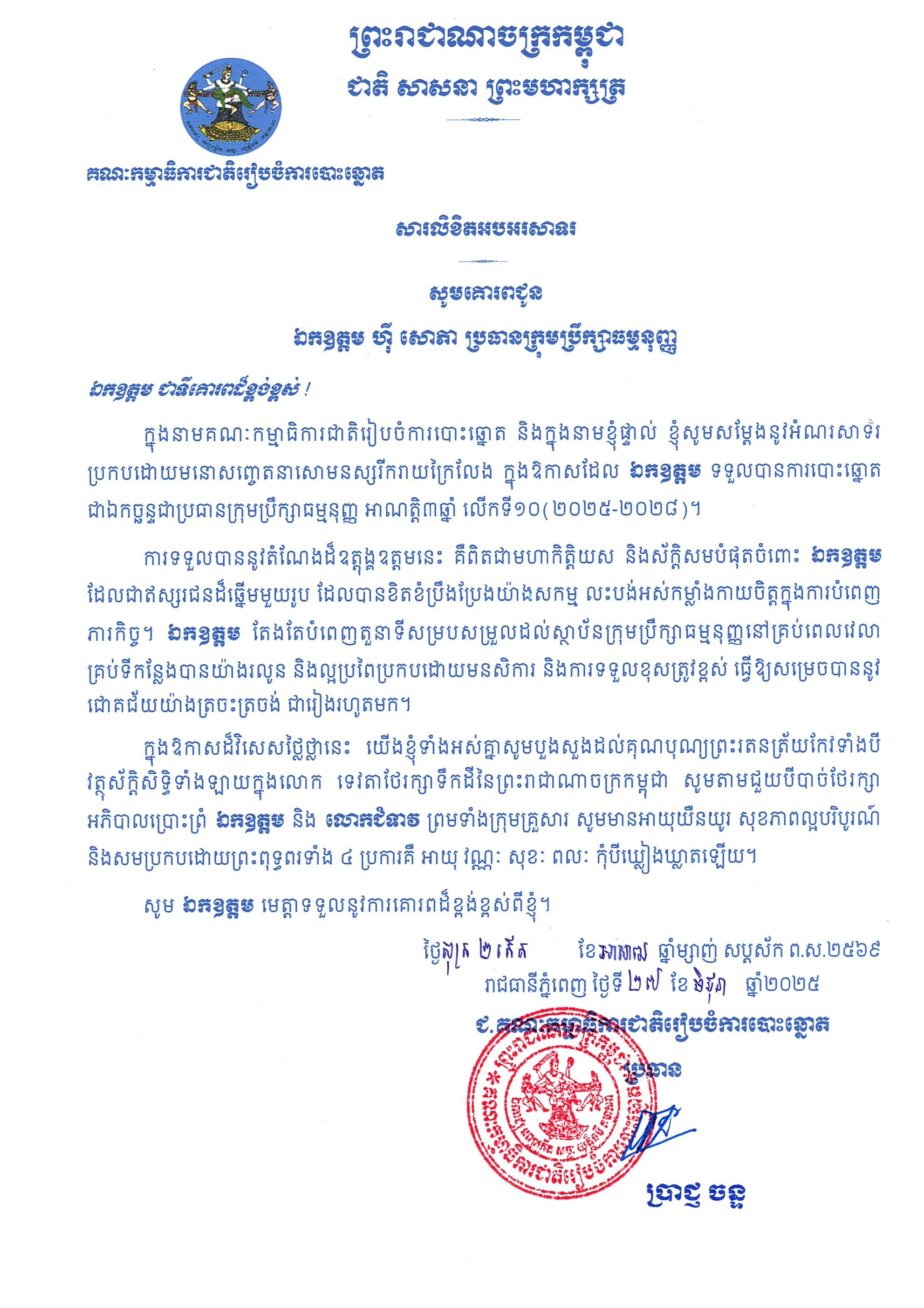 សារលិខិតអបអរសាទរ គោរពជូន ឯកឧត្តម ហ៊ី សោភា ប្រធានក្រុមប្រឹក្សាធម្មនុញ្ញ ក្នុងឱកាសដែល ឯកឧត្តម ទទួលបានការបោះឆ្នោត ជាឯកច្ឆន្ទជាប្រធានក្រុមប្រឹក្សាធម្មនុញ្ញ អាណត្តិ៣ឆ្នាំ លើកទី១០ (២០២៥-២០២៨)