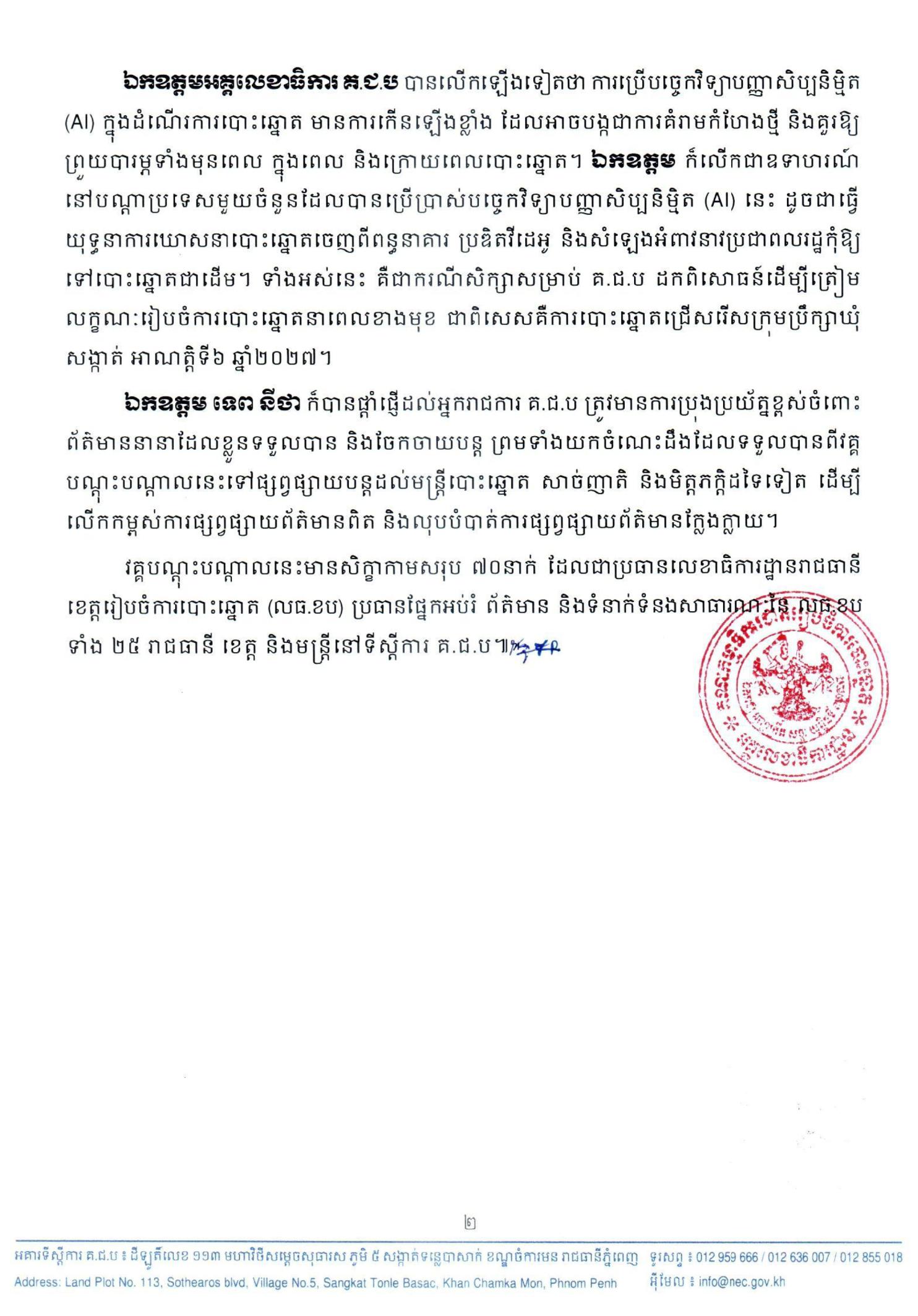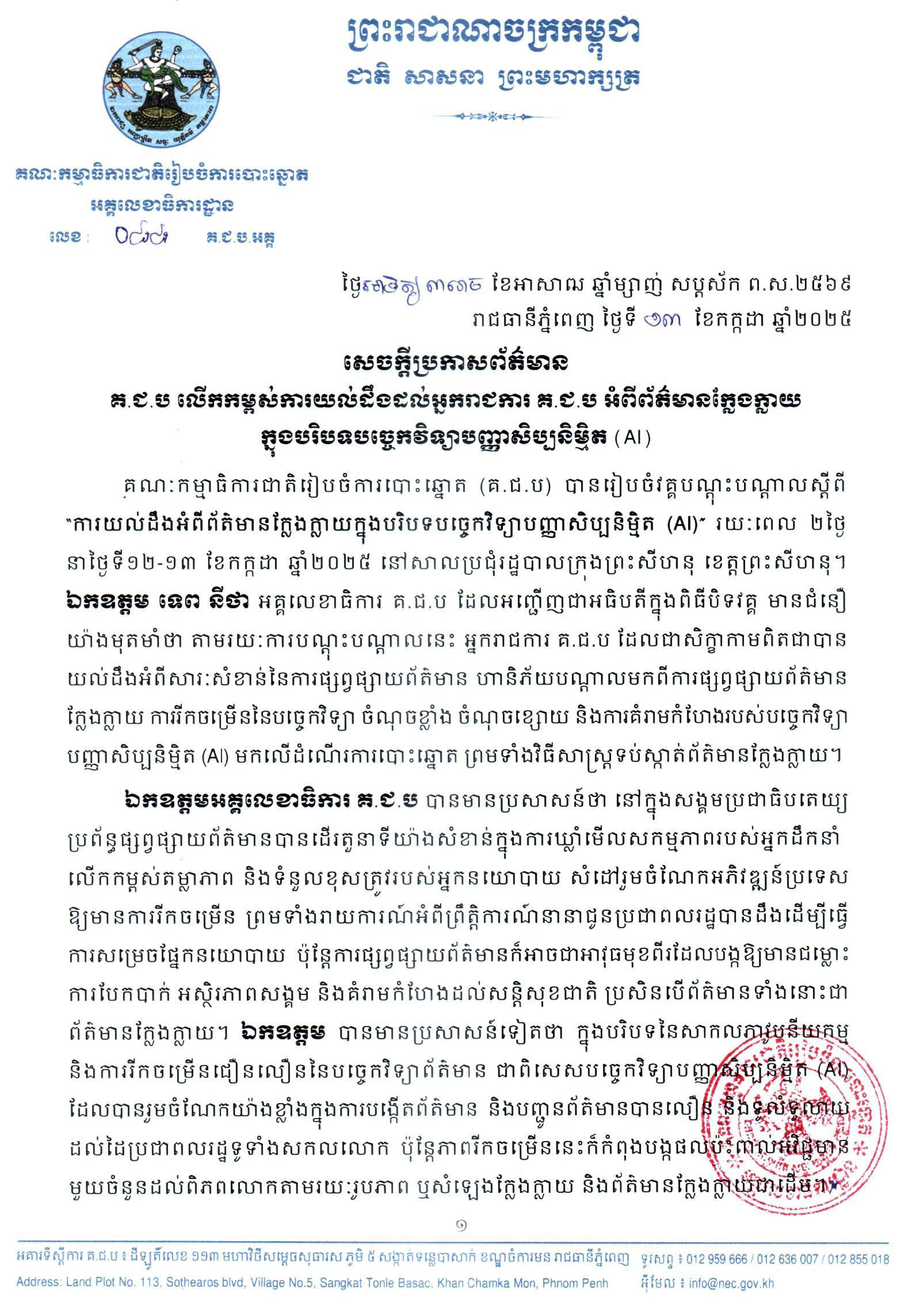 គណៈកម្មាធិការជាតិរៀបចំការបោះឆ្នោត (គ.ជ.ប) បានរៀបចំវគ្គបណ្ដុះបណ្ដាលស្ដីពី “ការយល់ដឹងអំពីព័ត៌មានក្លែងក្លាយក្នុងបរិបទបច្ចេកវិទ្យាបញ្ញាសិប្បនិម្មិត (AI)” រយៈពេល ២ថ្ងៃ នាថ្ងៃទី១២-១៣ ខែកក្កដា ឆ្នាំ២០២៥ នៅសាលប្រជុំរដ្ឋបាលក្រុងព្រះសីហនុ ខេត្តព្រះសីហនុ។ ឯកឧត្ដម ទេព នីថា អគ្គលេខាធិការ គ.ជ.ប ដែលអញ្ជើញជាអធិបតីក្នុងពិធីបិទវគ្គ មានជំនឿយ៉ាងមុតមាំថា តាមរយៈការបណ្ដុះបណ្ដាលនេះ អ្នករាជការ គ.ជ.ប ដែលជាសិក្ខាកាមពិតជាបានយល់ដឹងអំពីសារៈសំខាន់នៃការផ្សព្វផ្សាយព័ត៌មាន ហានិភ័យបណ្តាលមកពីការផ្សព្វផ្សាយព័ត៌មានក្លែងក្លាយ ការរីកចម្រើននៃបច្ចេកវិទ្យា ចំណុចខ្លាំង ចំណុចខ្សោយ និងការគំរាមកំហែងរបស់បច្ចេកវិទ្យាបញ្ញាសិប្បនិម្មិត (AI) មកលើដំណើរការបោះឆ្នោត ព្រមទាំងវិធីសាស្រ្តទប់ស្កាត់ព័ត៌មានក្លែងក្លាយ។