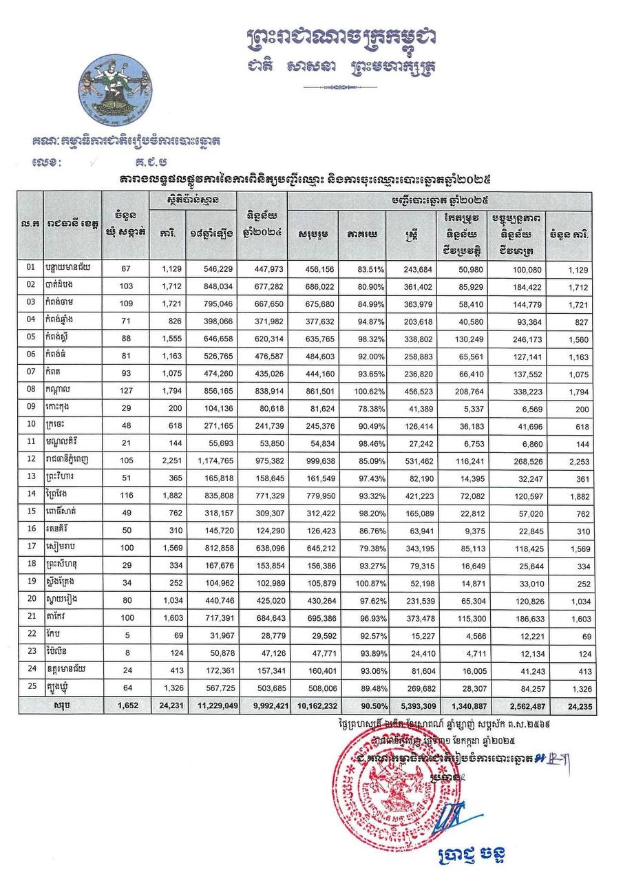 តារាងលទ្ធផលផ្លូវការនៃការពិនិត្យបញ្ជីឈ្មោះ និងការចុះឈ្មោះបោះឆ្នោត ឆ្នាំ២០២៥