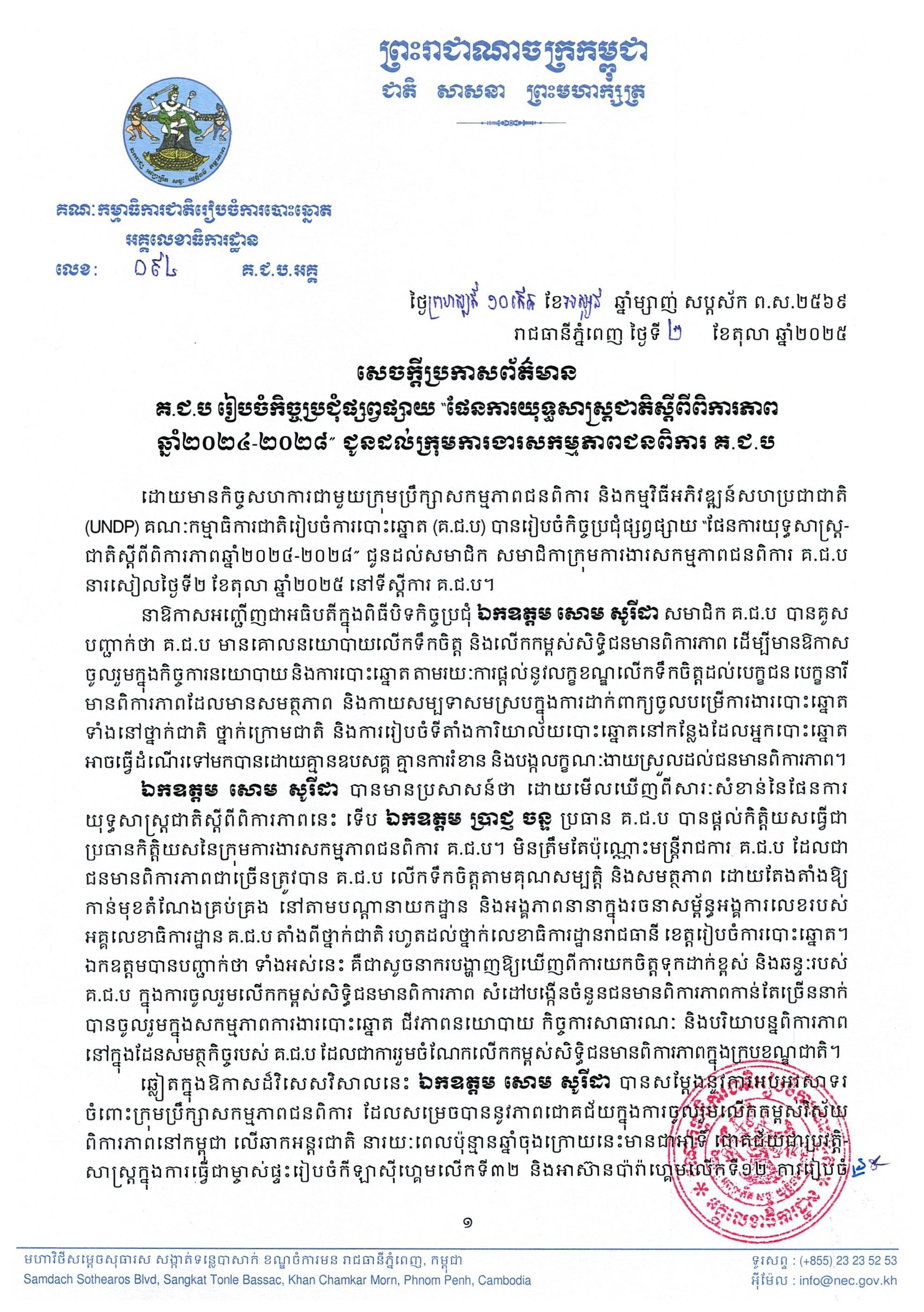 ដោយមានកិច្ចសហការជាមួយក្រុមប្រឹក្សាសកម្មភាពជនពិការ និងកម្មវិធីអភិវឌ្ឍន៍សហប្រជាជាតិ (UNDP) គណៈកម្មាធិការជាតិរៀបចំការបោះឆ្នោត (គ.ជ.ប) បានរៀបចំកិច្ចប្រជុំផ្សព្វផ្សាយ “ផែនការយុទ្ធសាស្រ្តជាតិស្តីពីពិការភាពឆ្នាំ២០២៤-២០២៨” ជូនដល់សមាជិក សមាជិកាក្រុមការងារសកម្មភាពជនពិការ គ.ជ.ប នារសៀលថ្ងៃទី២ ខែតុលា ឆ្នាំ២០២៥ នៅទីស្តីការ គ.ជ.ប។