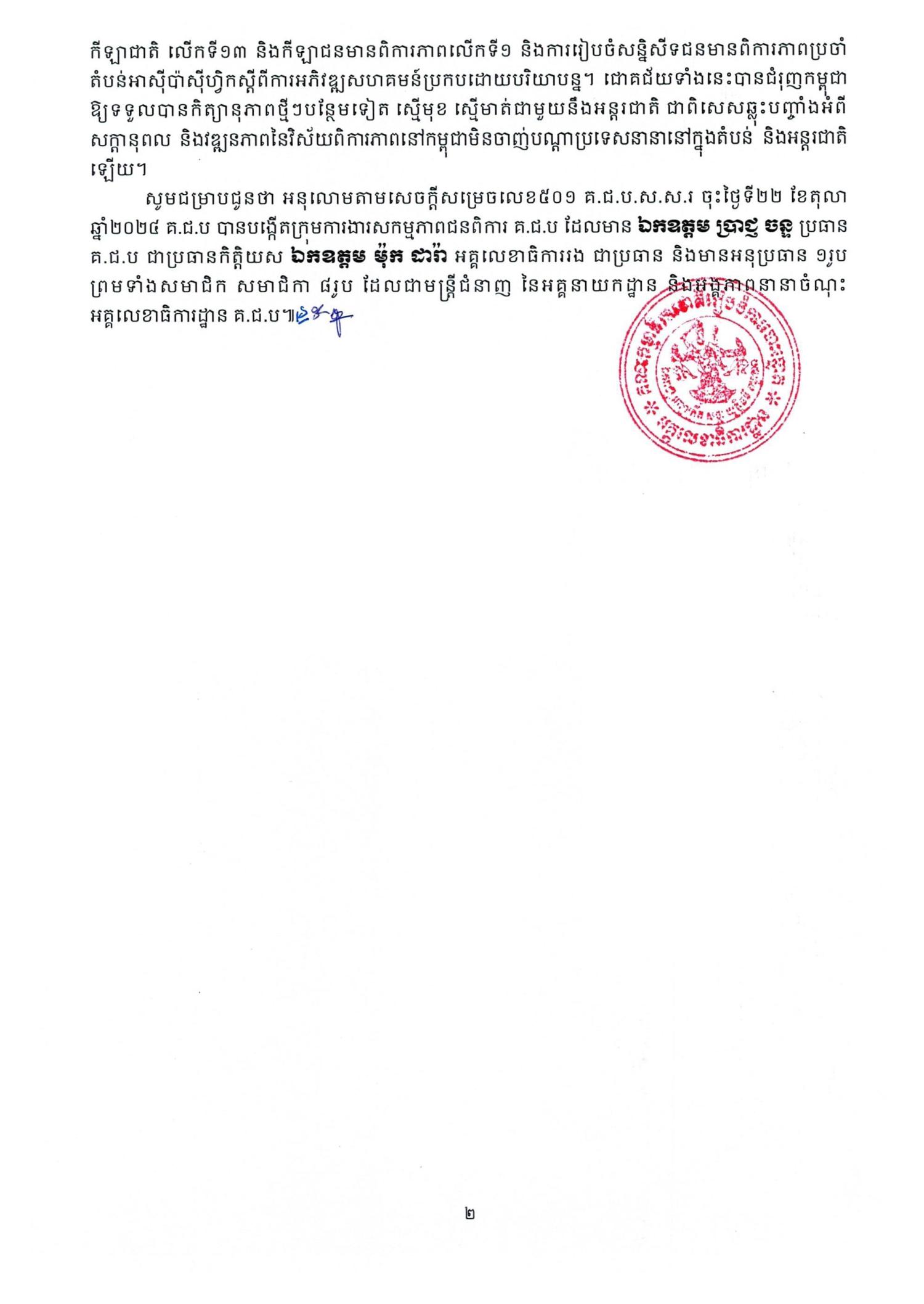 សូមជម្រាបជូនថា អនុលោមតាមសេចក្ដីសម្រេចលេខ៥០១ គ.ជ.ប.ស.ស.រ ចុះថ្ងៃទី២២ ខែតុលា ឆ្នាំ២០២៤ គ.ជ.ប បានបង្កើតក្រុមការងារសកម្មភាពជនពិការ គ.ជ.ប ដែលមាន ឯកឧត្តម ប្រាជ្ញ ចន្ទ ប្រធាន គ.ជ.ប ជាប្រធានកិត្តិយស ឯកឧត្តម ម៉ុក ដារ៉ា អគ្គលេខាធិការរង ជាប្រធាន និងមានអនុប្រធាន ១រូប ព្រមទាំងសមាជិក សមាជិកា ៨រូប ដែលជាមន្ត្រីជំនាញ នៃអគ្គនាយកដ្ឋាន និងអង្គភាពនានាចំណុះអគ្គលេខាធិការដ្ឋាន គ.ជ.ប៕