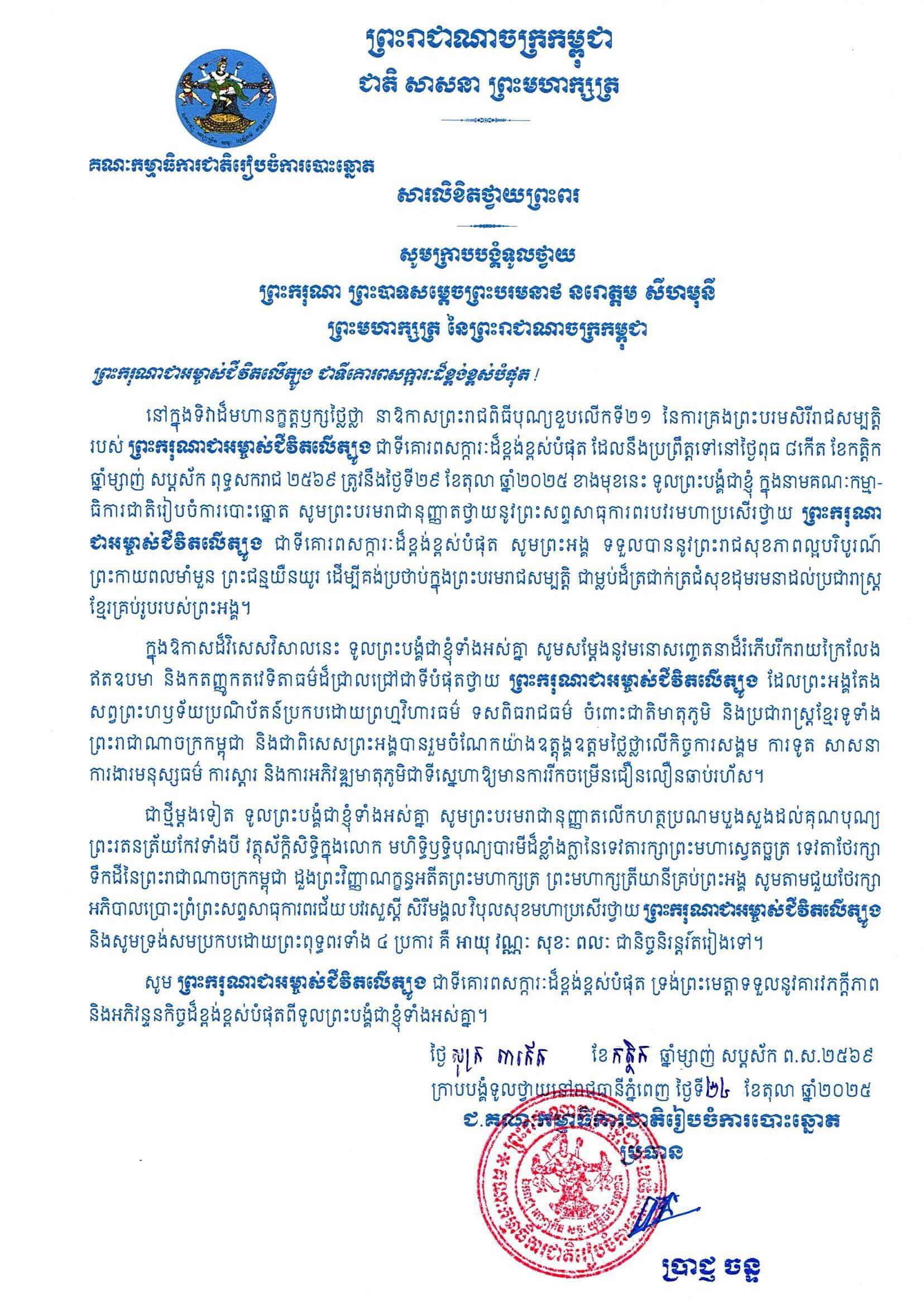 សារលិខិតថ្វាយព្រះពរ ព្រះករុណា ព្រះបាទសម្ដេចព្រះបរមនាថ នរោត្តម សីហមុនី ព្រះមហាក្សត្រ នៃព្រះរាជាណាចក្រកម្ពុជា នៅក្នុងទិវាដ៏មហានក្ខត្តឫក្សថ្លៃថ្លា នាឱកាសព្រះរាជពិធីបុណ្យខួបលើកទី២១ នៃការគ្រងព្រះបរមសិរីរាជសម្បត្តិ