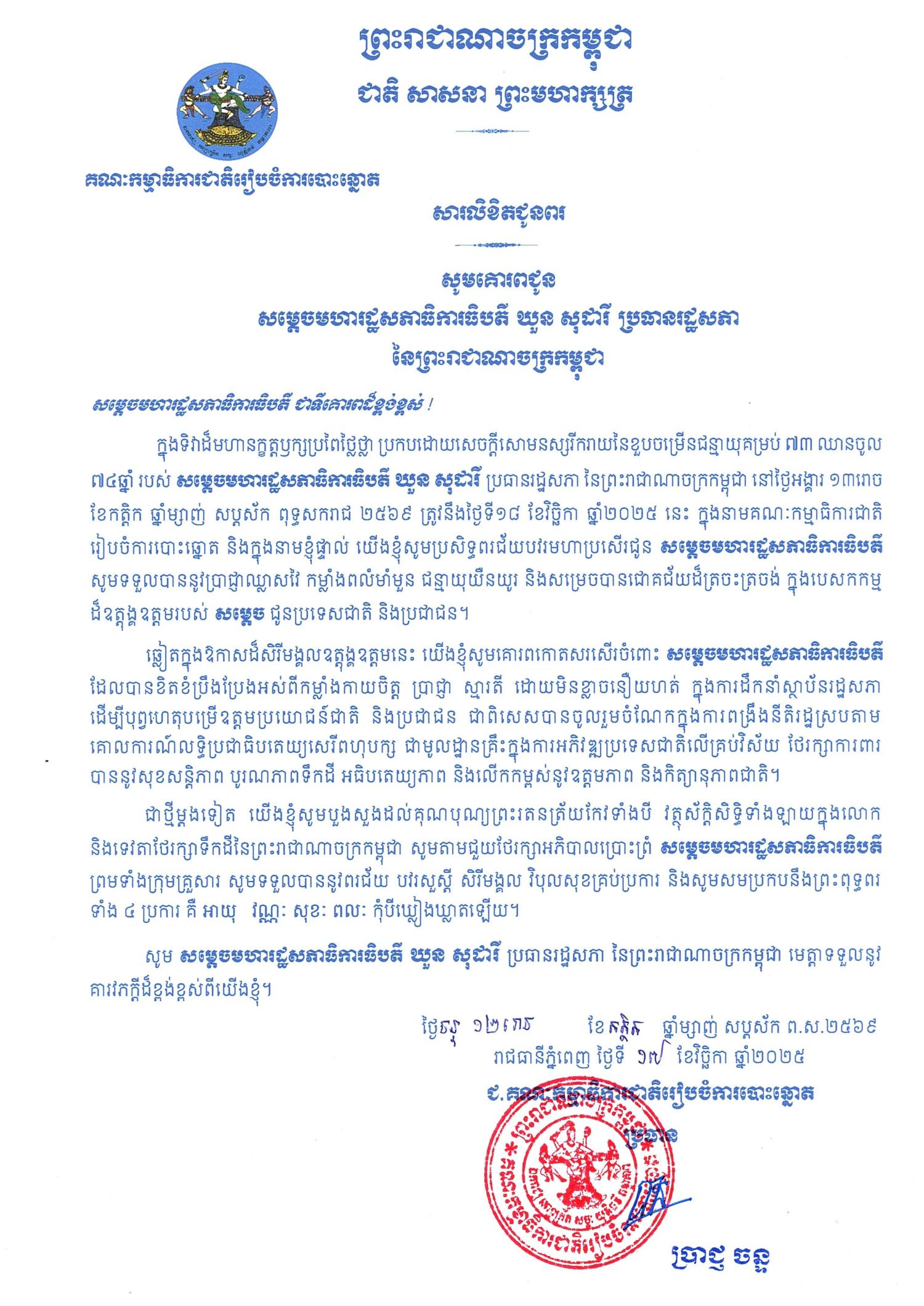 សារលិខិតជូនពរ សូមគោរពជូន សម្ដេចមហារដ្ឋសភាធិការធិបតី ឃួន សុដារី ប្រធានរដ្ឋសភា នៃព្រះរាជាណាចក្រកម្ពុជា ក្នុងទិវាដ៏មហានក្ខត្តឫក្សប្រពៃថ្លៃថ្លា ប្រកបដោយសេចក្ដីសោមនស្សរីករាយនៃខួបចម្រើនជន្មាយុគម្រប់ ៧៣ ឈានចូល ៧៤ ឆ្នាំ