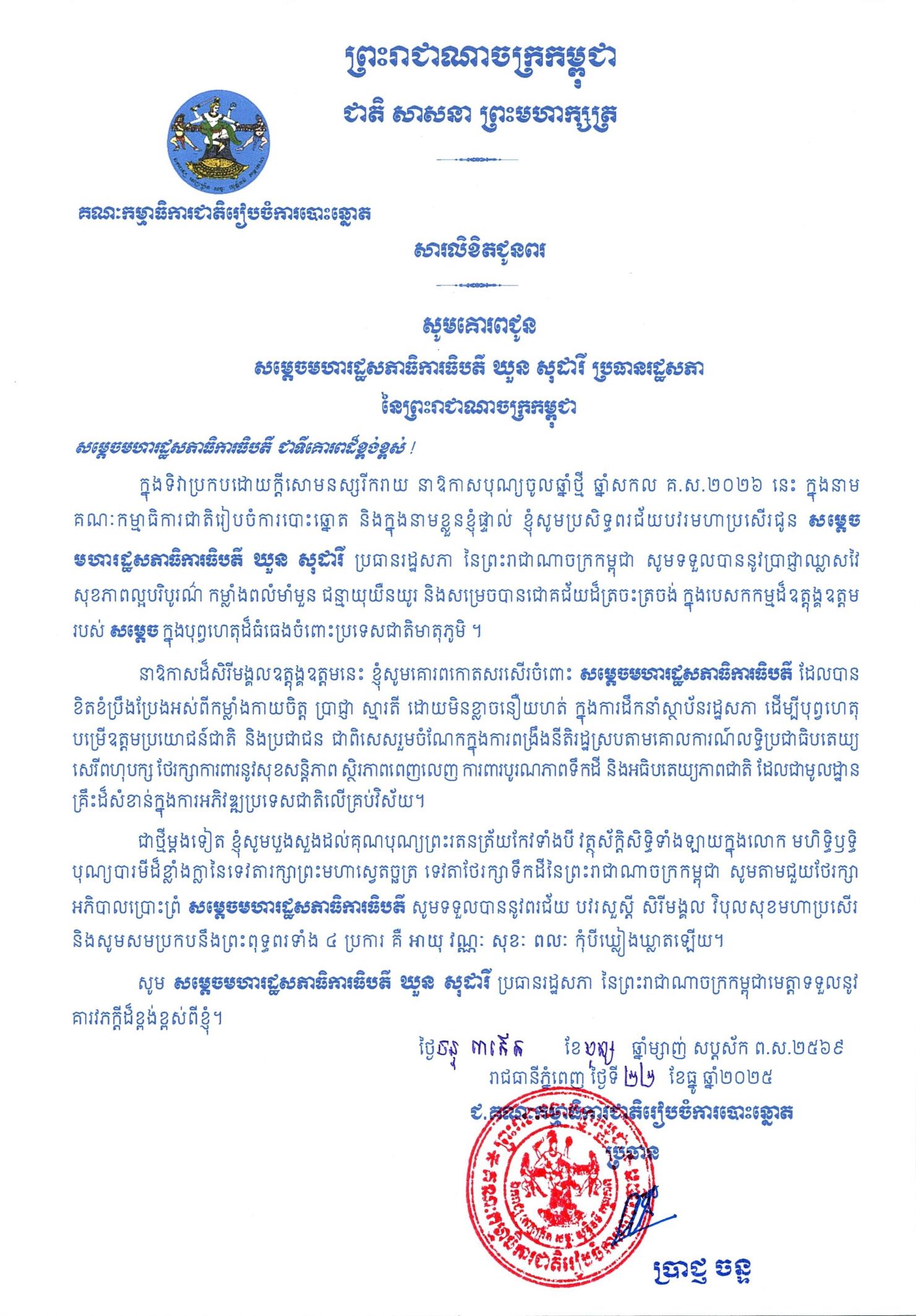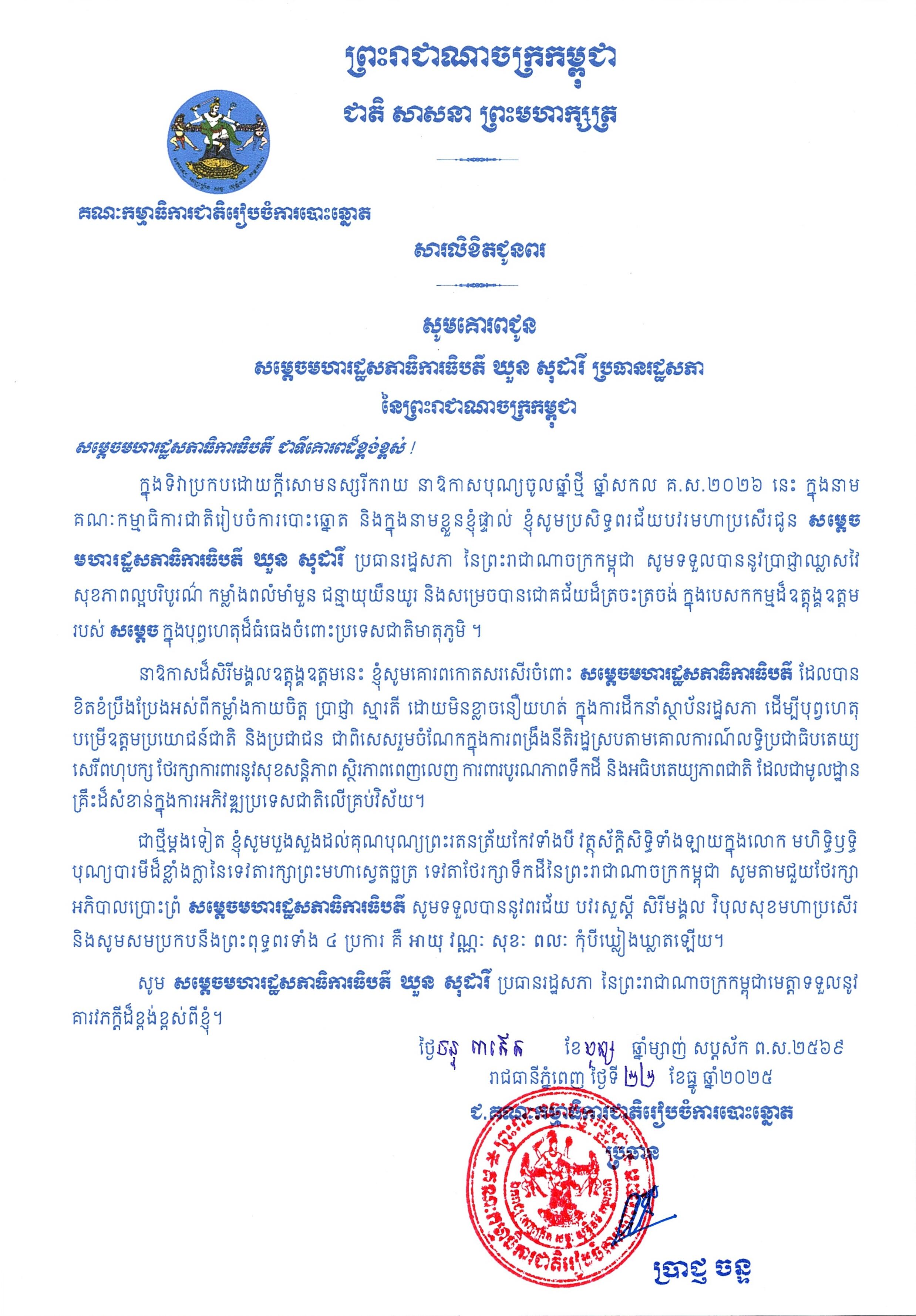 សារលិខិតជូនពរ សម្តេចមហារដ្ឋសភាធិការធិបតី ឃួន សុដារី ប្រធានរដ្ឋសភា នៃព្រះរាជាណាចក្រកម្ពុជា ក្នុងទិវាប្រកបដោយក្តីសោមនស្សរីករាយ នាឱកាសបុណ្យចូលឆ្នាំថ្មី ឆ្នាំសកល គ.ស.២០២៦