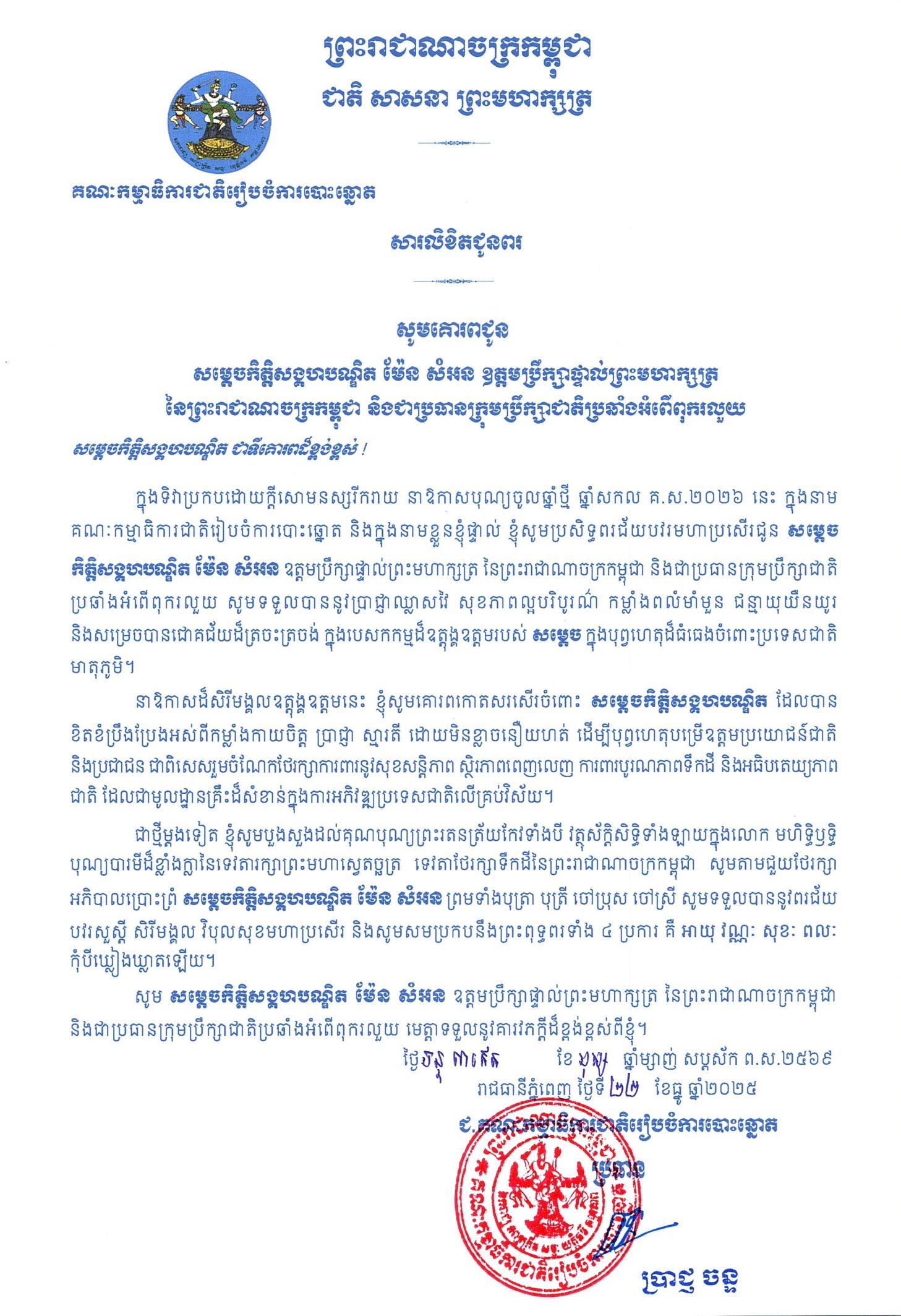 សារលិខិតជូនពរ សម្តេចកិត្តិសង្គហបណ្ឌិត ម៉ែន សំអន ឧត្តមប្រឹក្សាផ្ទាល់ព្រះមហាក្សត្រ នៃព្រះរាជាណាចក្រកម្ពុជា និងជាប្រធានក្រុមប្រឹក្សាជាតិប្រឆាំងអំពើពុករលួយ ក្នុងទិវាប្រកបដោយក្តីសោមនស្សរីករាយ នាឱកាសបុណ្យចូលឆ្នាំថ្មី ឆ្នាំសកល គ.ស.២០២៦