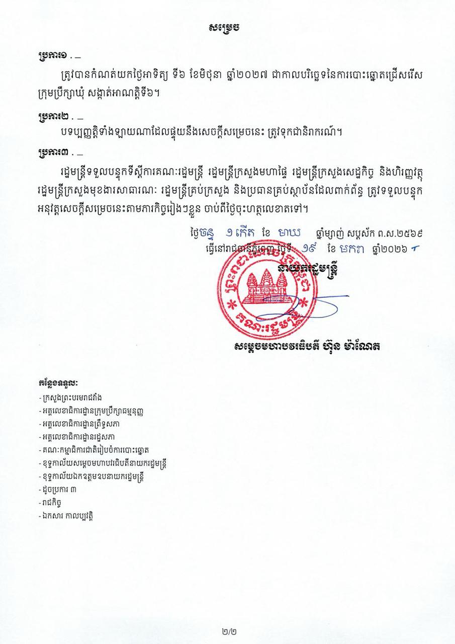 សេចក្តីសម្រេចរបស់រាជរដ្ឋាភិបាល លេខ ១១ ស.ស.រ ស្តីពី ការប្រកាសកាលបរិច្ឆេទនៃការបោះឆ្នោតជ្រើសរើសក្រុមប្រឹក្សាឃុំ សង្កាត់ អាណត្តិទី៦