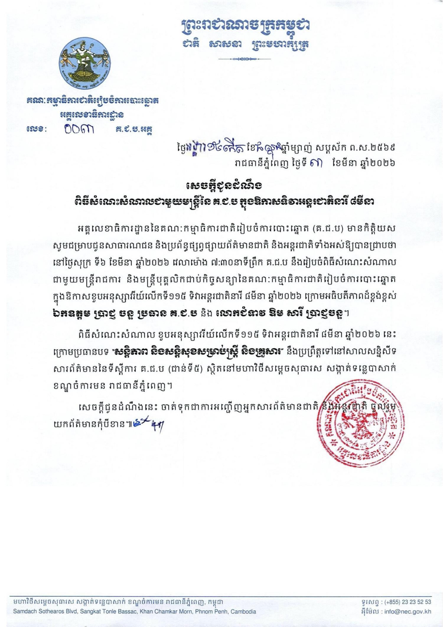 សេចក្តីជូនដំណឹង លេខ ០០៣ គ.ជ.ប.អគ្គ៖ ពិធីសំណេះសំណាលជាមួយមន្ត្រីនៃ គ.ជ.ប ក្នុងឱកាសទិវាអន្តរជាតិនារី ៨មីនា