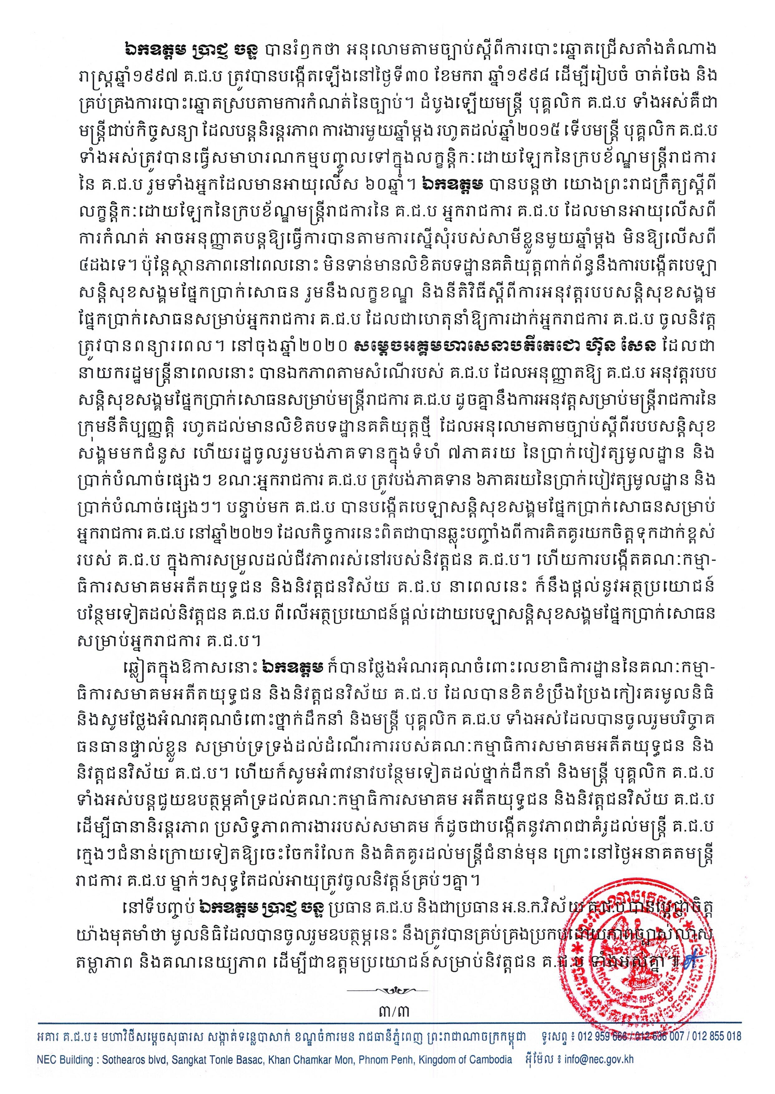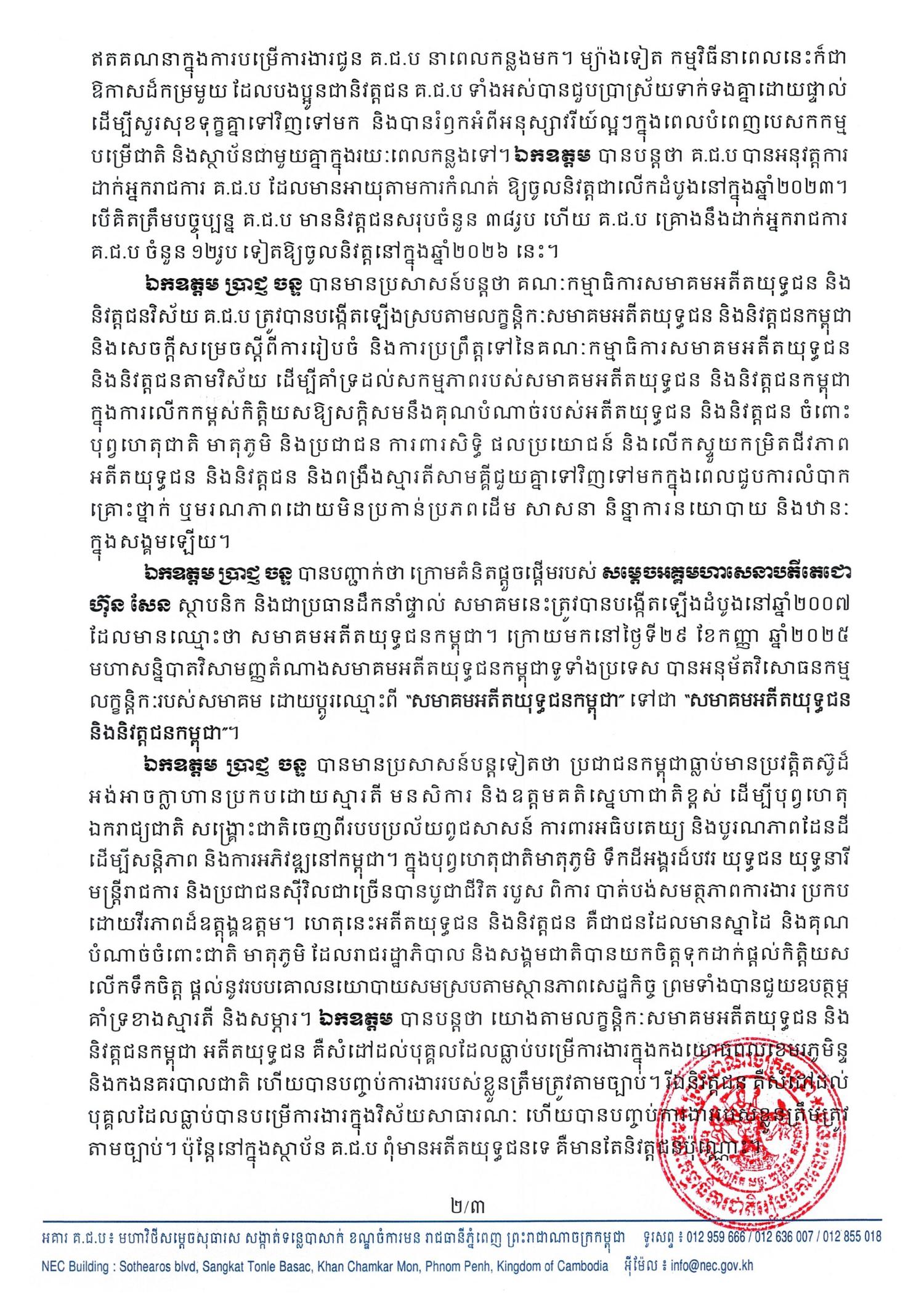 សេចក្តីប្រកាសព័ត៌មានរបស់អ្នកនាំពាក្យ គ.ជ.ប លេខ ០០៤ គ.ជ.ប ស្តីពី ពិធីប្រកាសដាក់ឱ្យដំណើរការគណៈកម្មាធិការសមាគមអតីតយុទ្ធជន និងនិវត្តជនកម្ពុជា វិស័យគណៈកម្មាធិការជាតិរៀបចំការបោះឆ្នោត