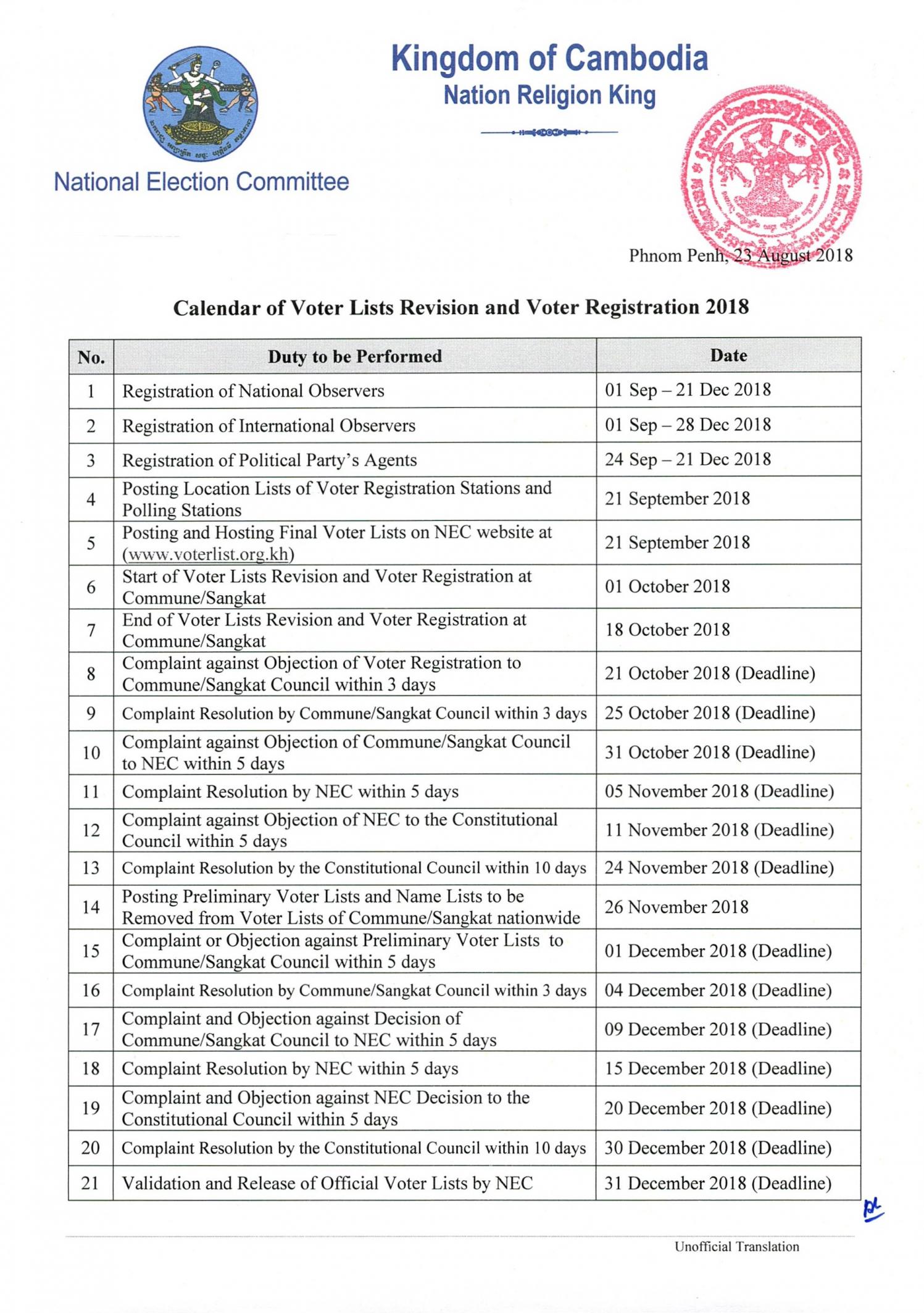 Calendar of Voter Lists Revision and Voter Registration 2018