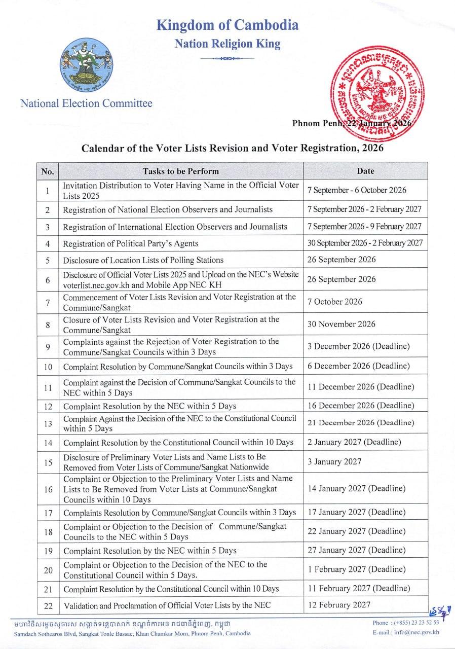 Calendar of the Voter Lists Revision and Voter Registration, 2026