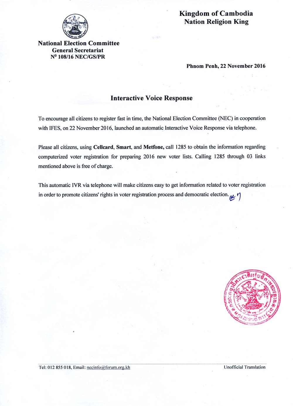 To encourage all citizens to register fast in time, the NEC in cooperation with IFES, on 22 November 2016, launched automatic Interactive Voice Response via telephone