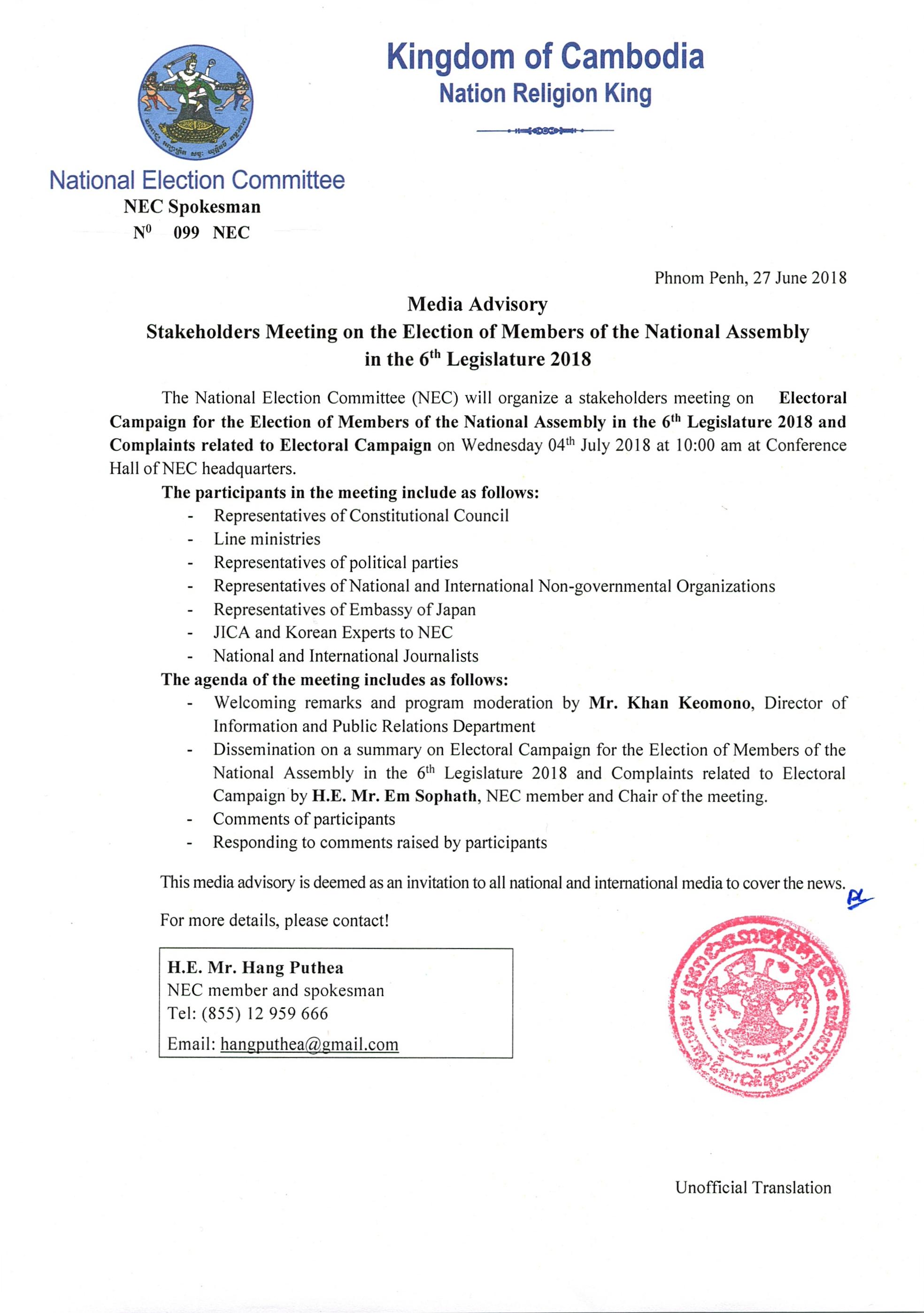 Media Advisory: Stakeholders Meeting in the Election Of Members of the National Assembly in the 6th Legislature