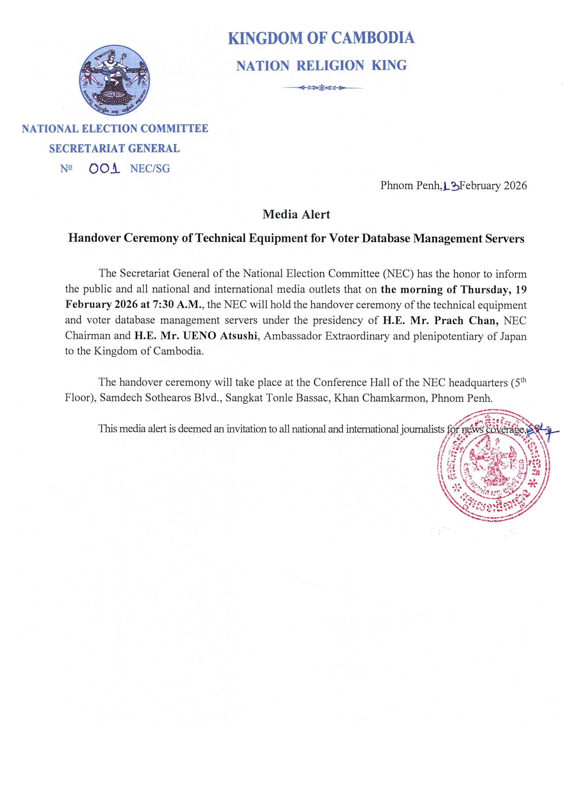 Media Alert Handover Ceremony of Technical Equipment for Voter Database Management Servers