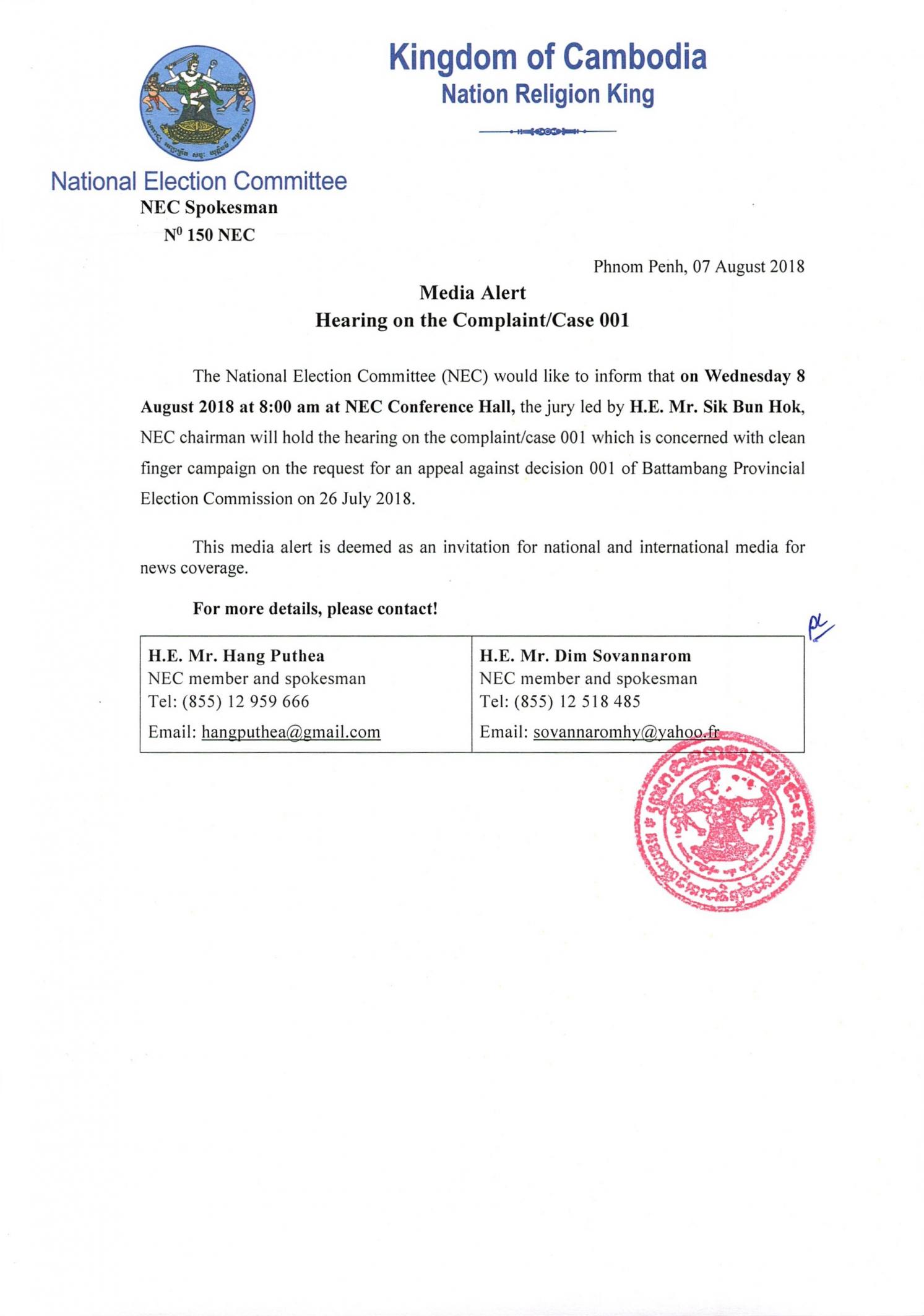 Media Alert: Hearing on the Complaint/Case 001