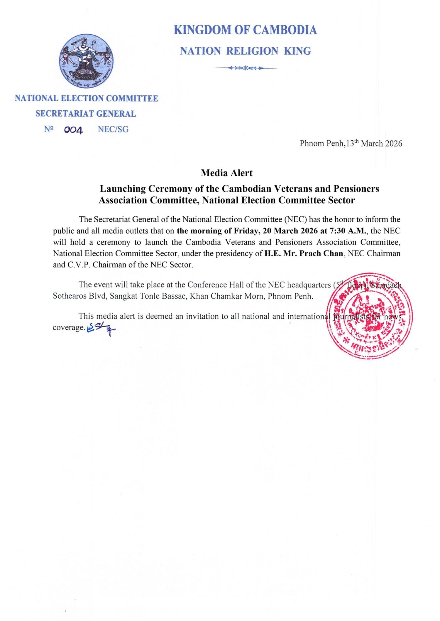 Media Alert: Launching Ceremony of the Cambodian Veterans and Pensioners Association Committee, National Election Committee Sector