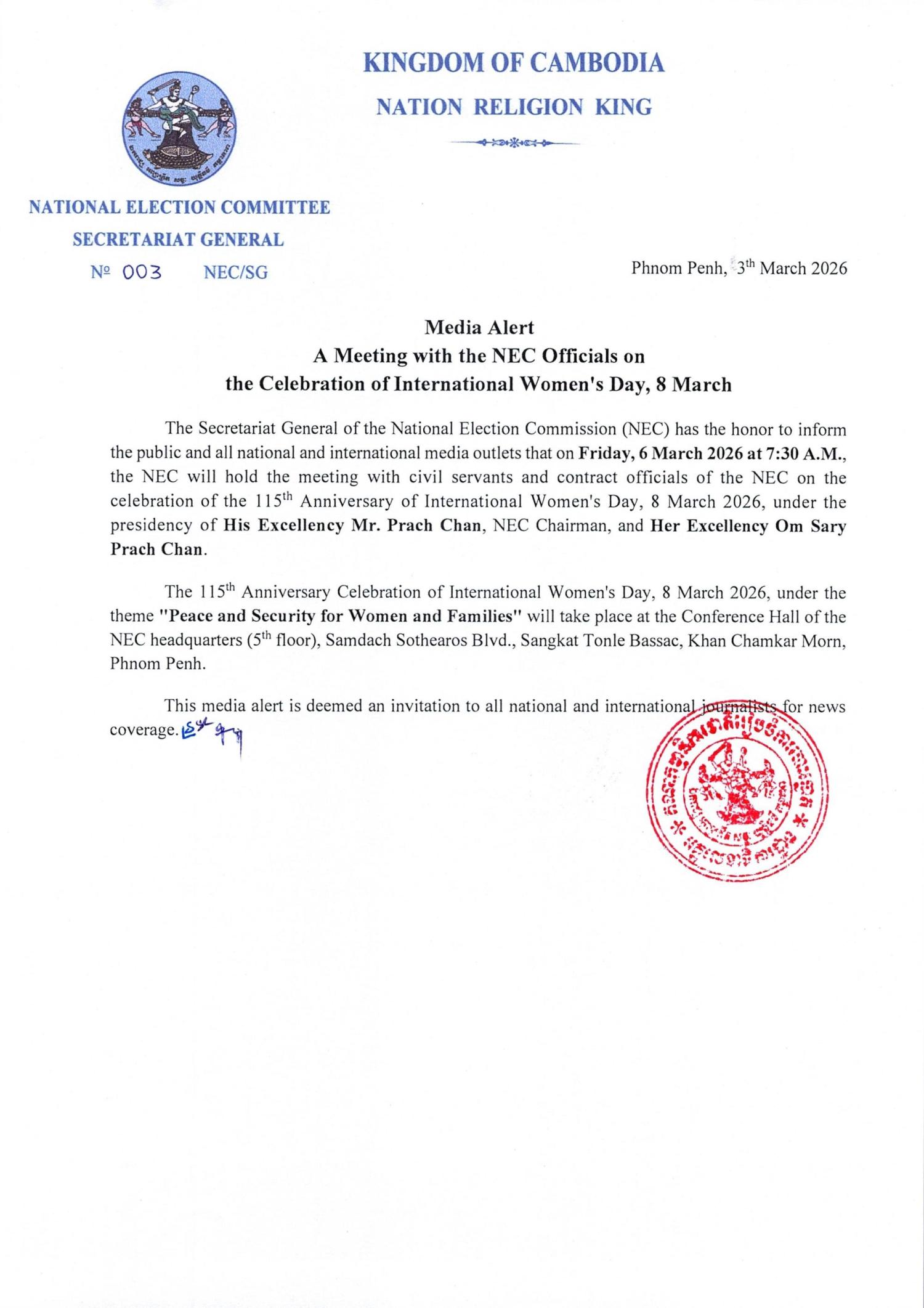 Media Alert A Meeting with the NEC Officials on the Celebration of International Women's Day, 8 March