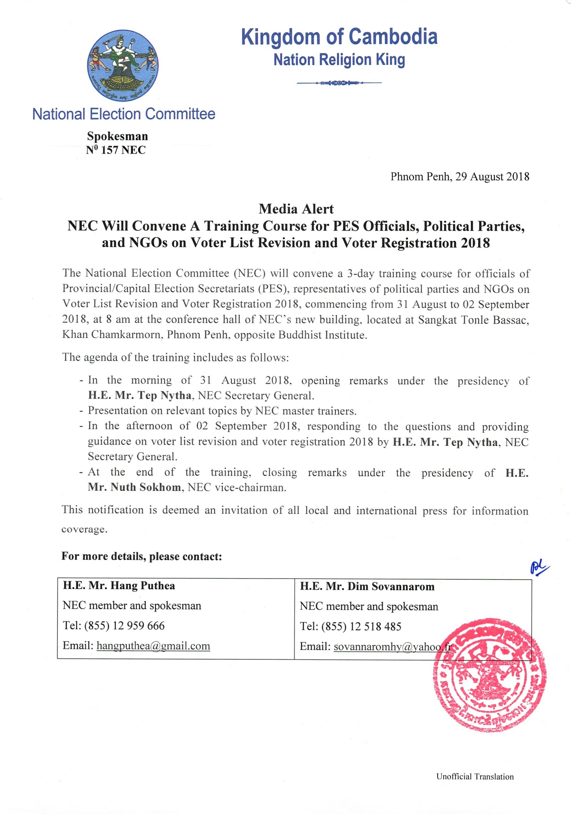 Media Alert: NEC Will Convene a Training Course for PES Officials, Political Parties, and NGOs on Voter Revision and Voter Registration