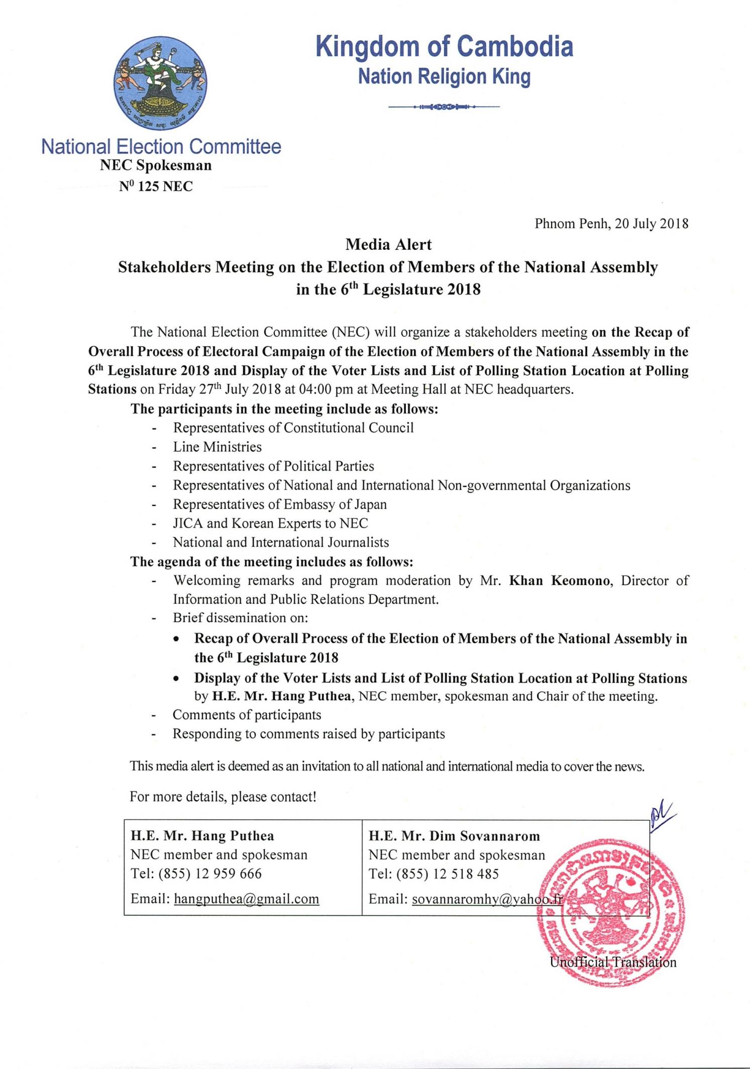 Media Alert: Stakeholder Meeting on the Election of Members of the National Assembly in the 6th Legislature 2018