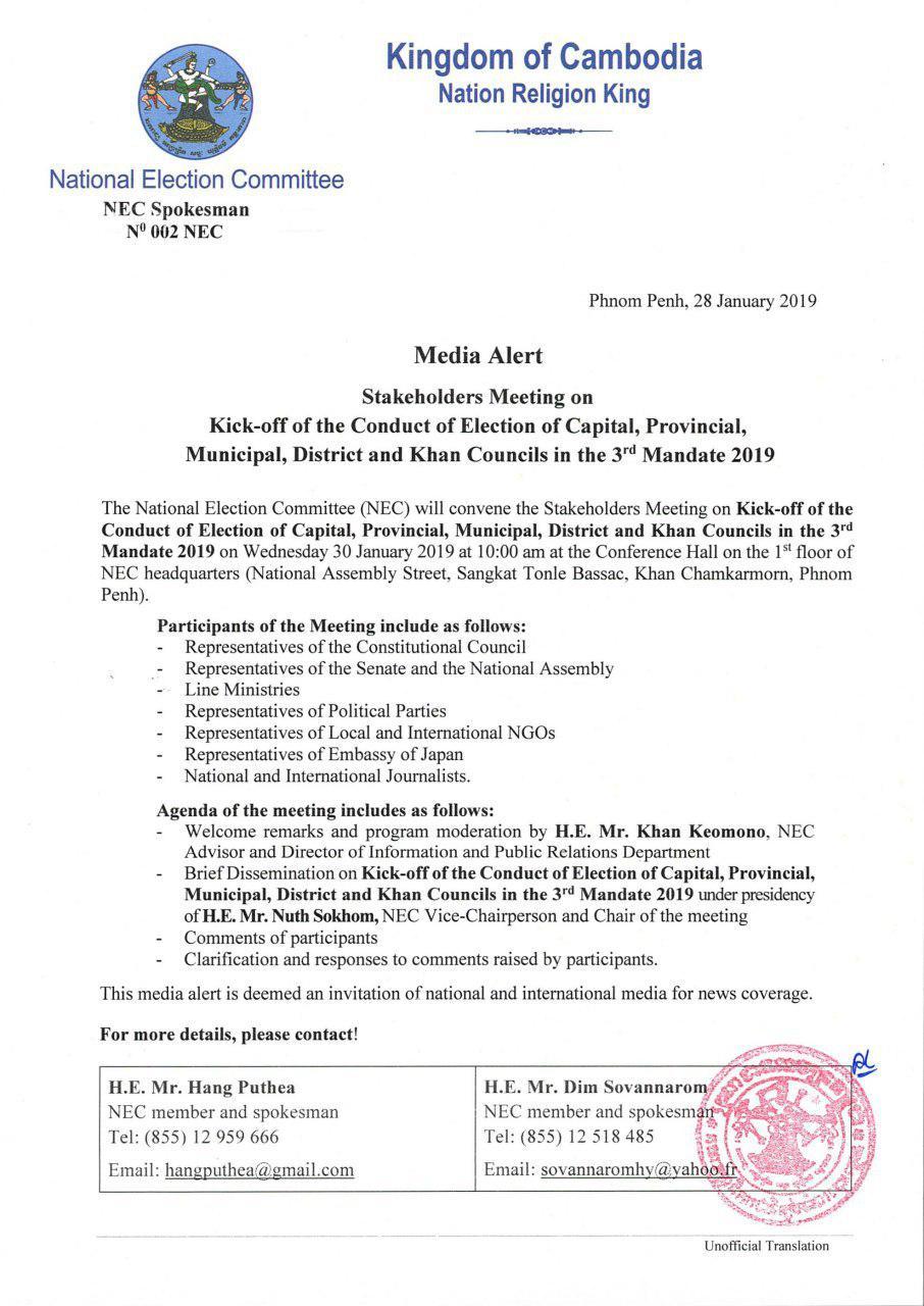 Media Alert: Stakeholder Meeting on Kick-off of the Conduct of Election of Capital, Provincial, Municipal, District and Khan Councils in the 3rd Mandate 2019
