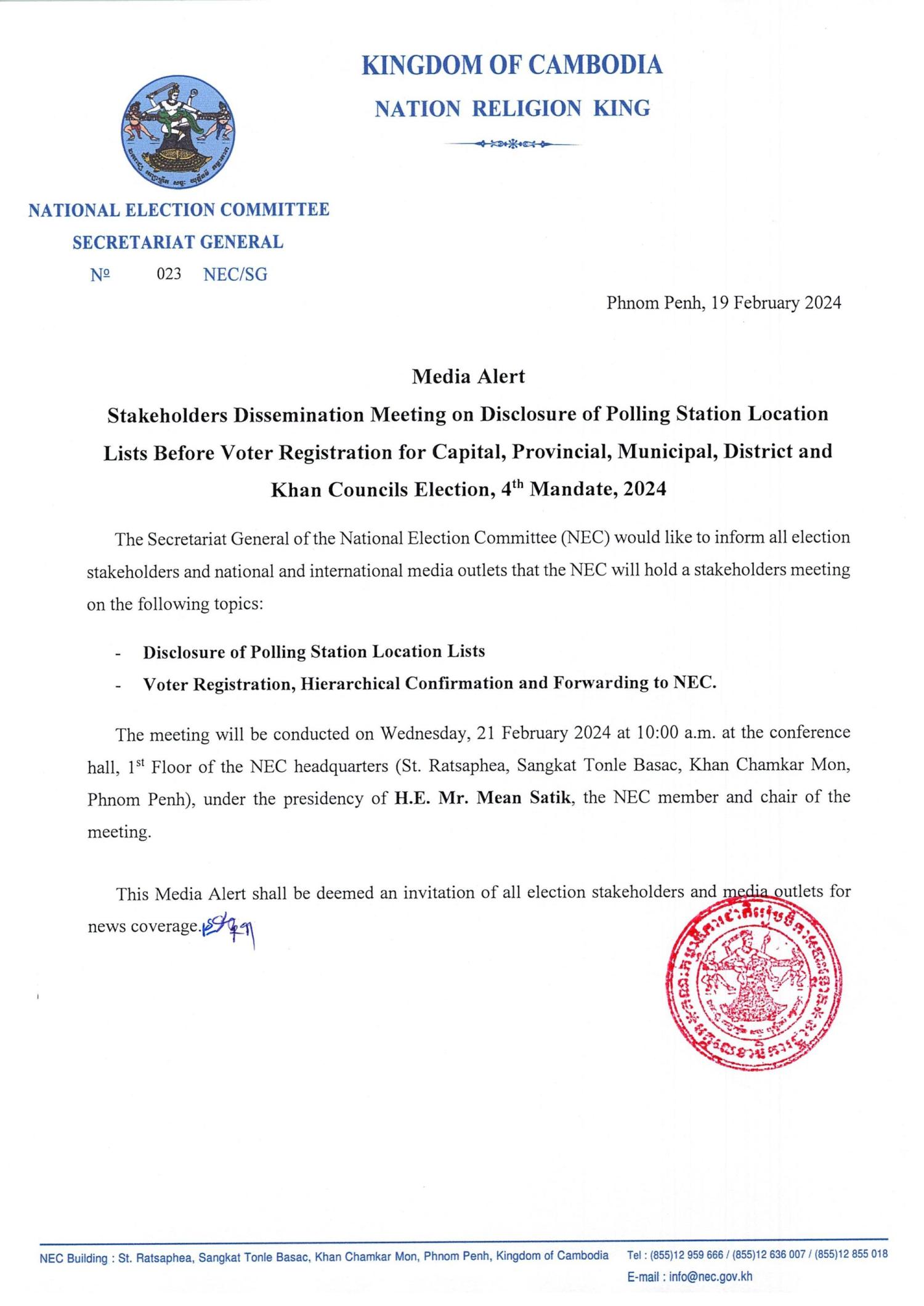 Media Alert Stakeholders Dissemination Meeting on Disclosure of Polling Station Location Lists Before Voter Registration for Capital, Provincial, Municipal, District and Khan Councils Election, 4th Mandate, 2024