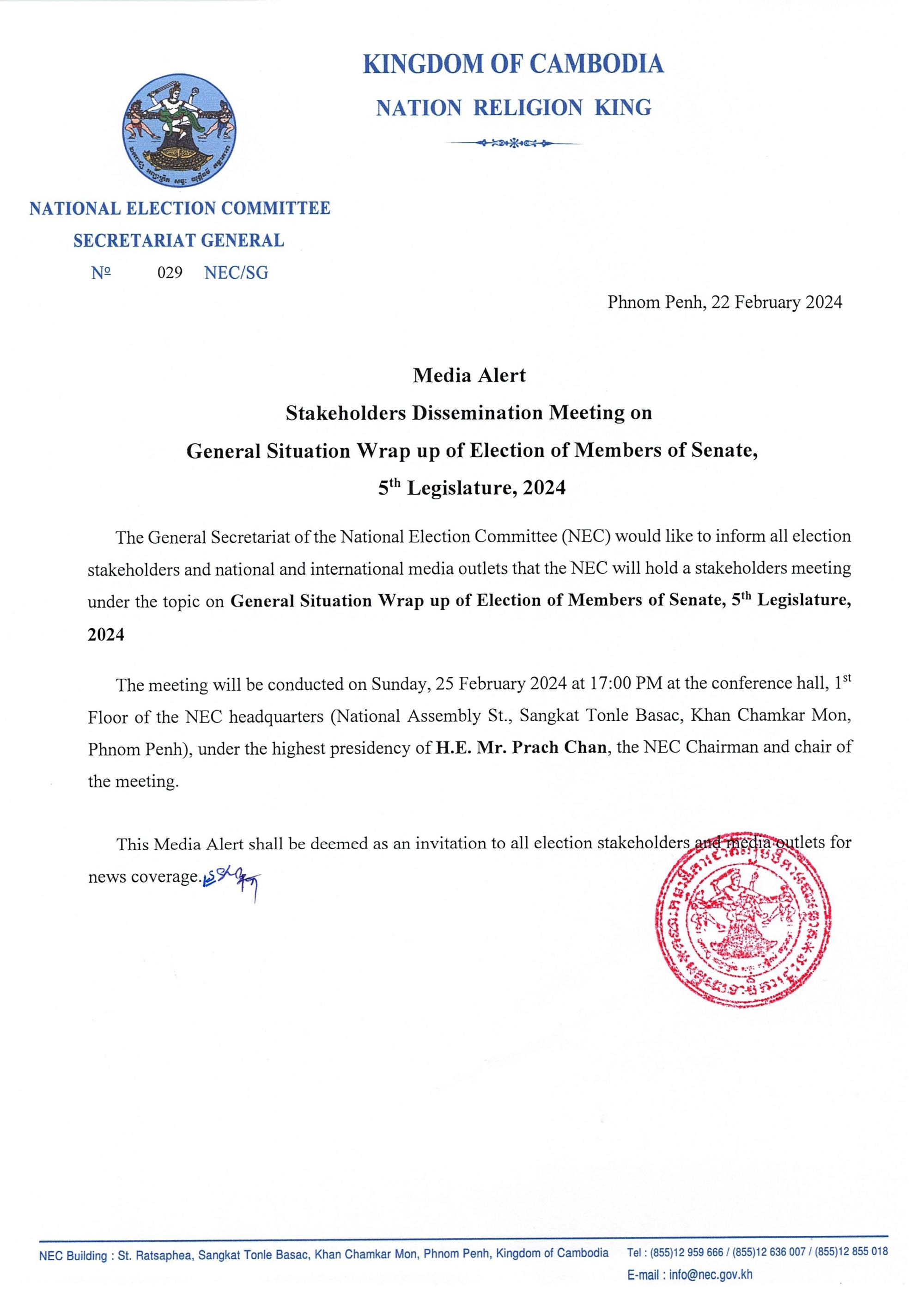 Media Alert Stakeholders Dissemination Meeting on General Situation Wrap up of Election of Members of Senate, 5th Legislature, 2024