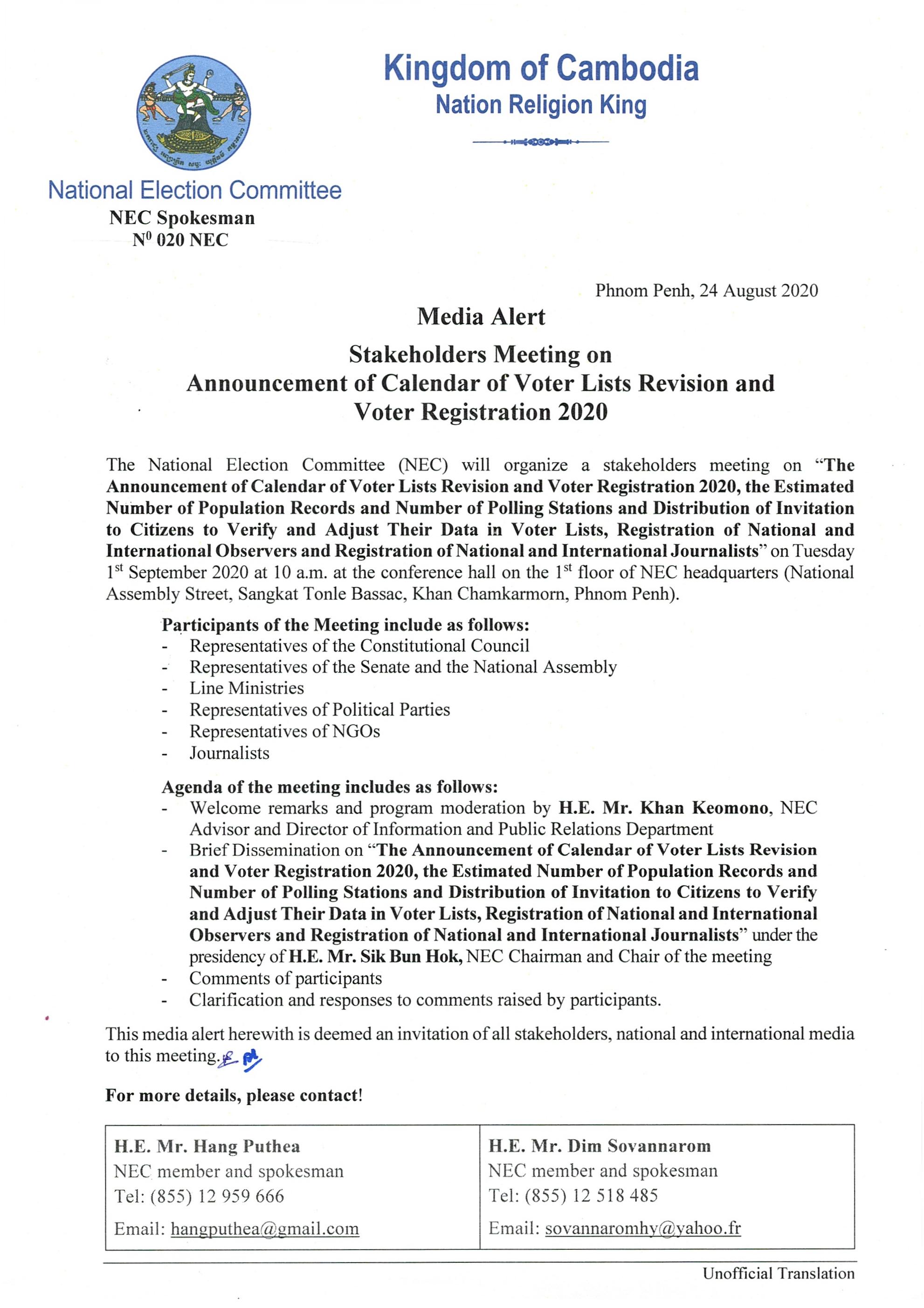 Media Alert : Stakeholders Meeting on Announcement of Calendar of Voter Lists Revision and Voter Registration 2020