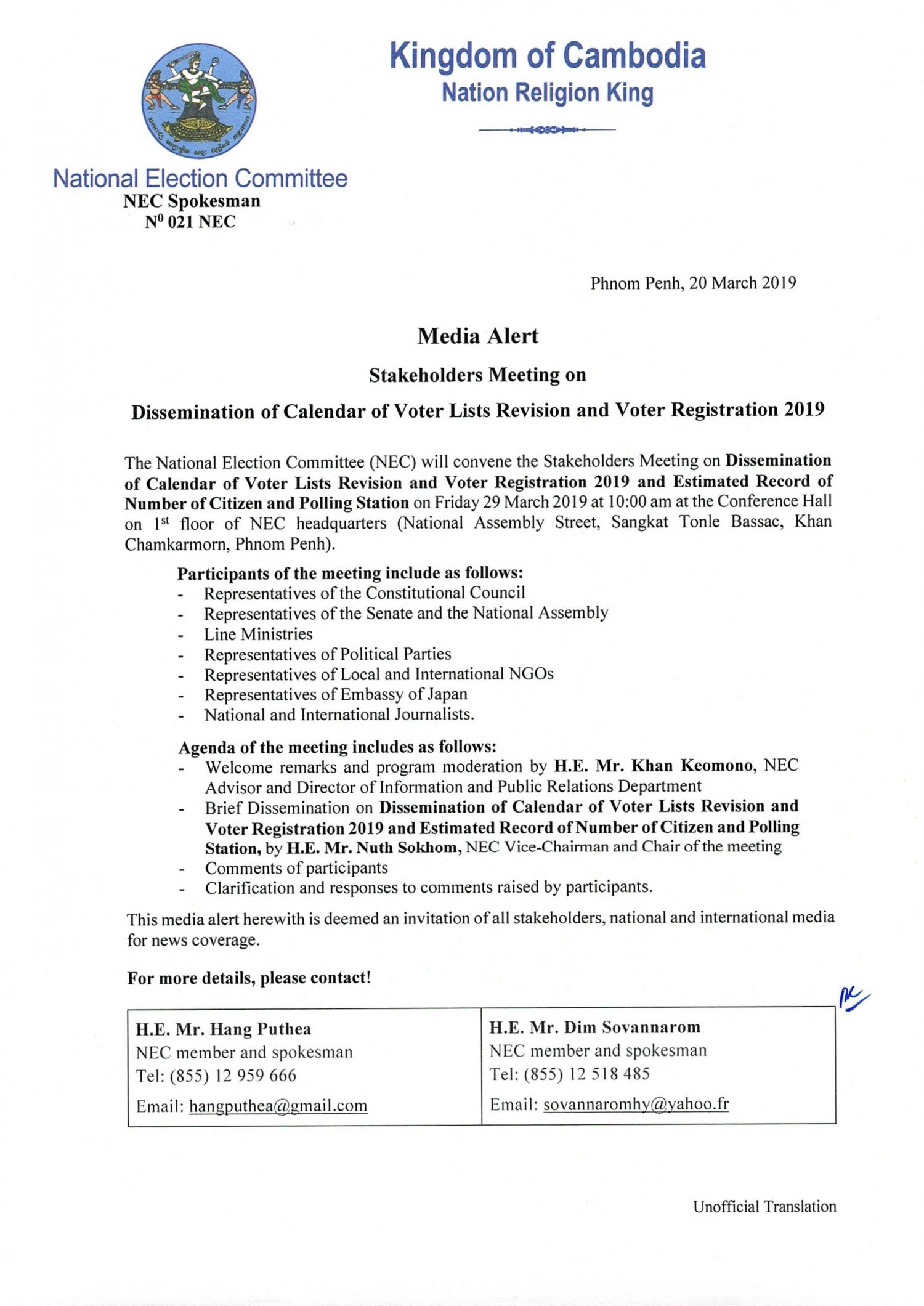 Media Alert: Stakeholders Meeting on Dissemination of Calendar of Voter Lists Revision and Voter Registration 2019