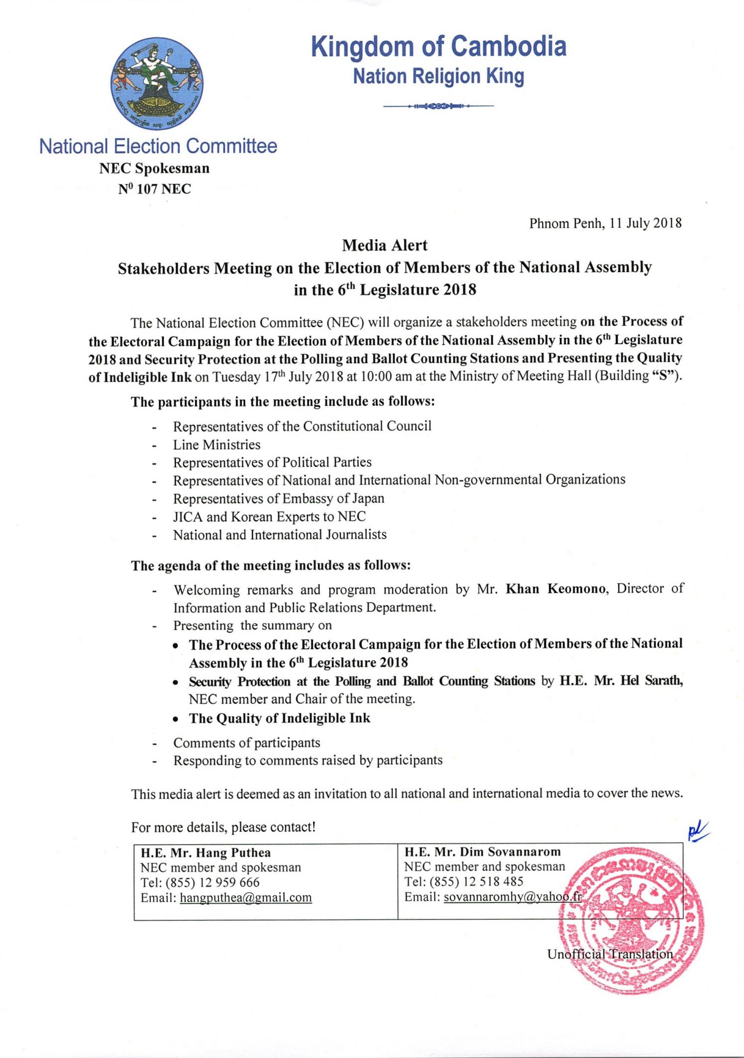 Media Alert: Stakeholders Meeting on the Election of Members of the National Assembly in the 6th Legislature 2018