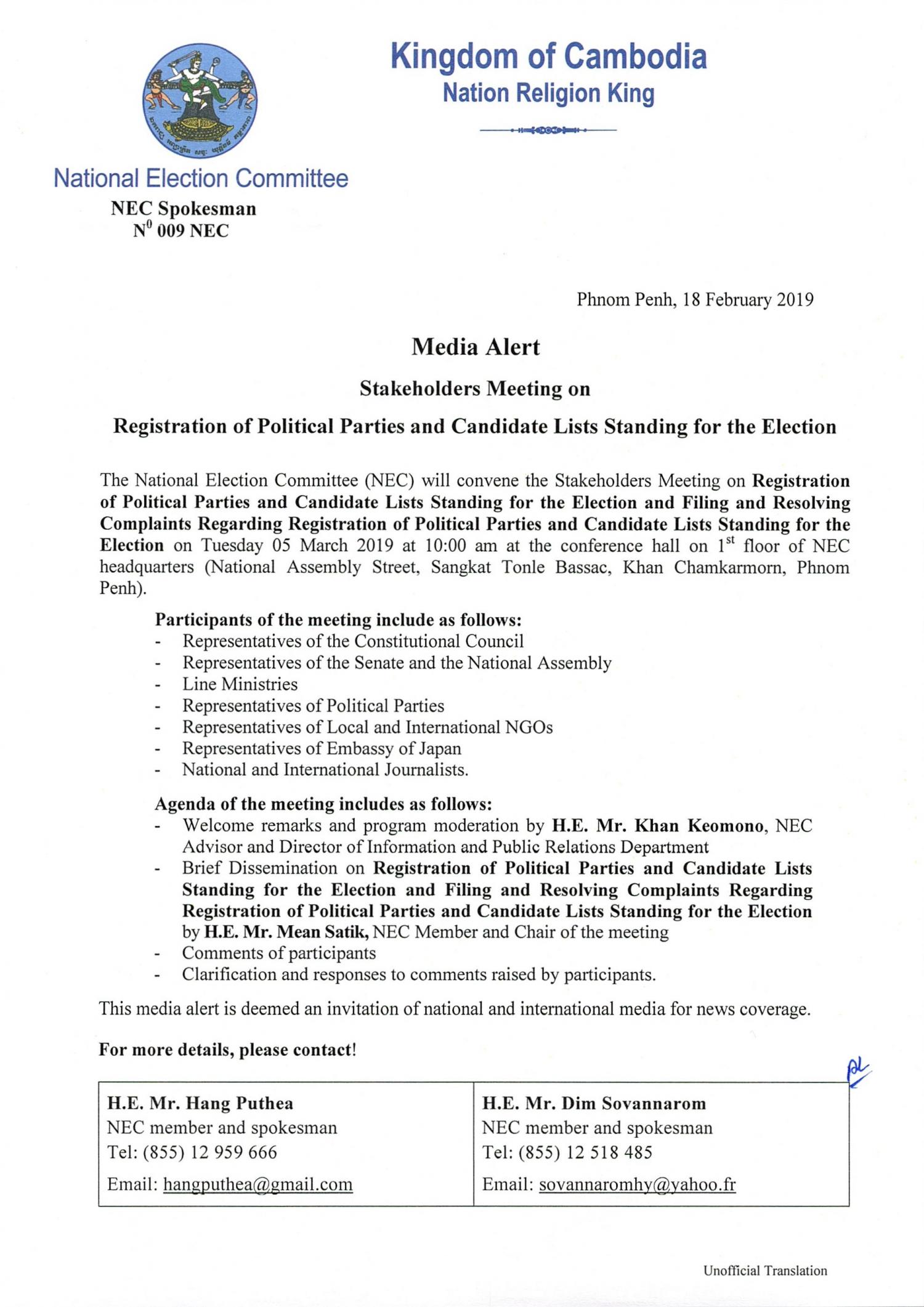 The National Election Committee (NEC) will convene the Stakeholders Meeting on Registration of Political Parties and Candidate Lists Standing for the Election and Filing and Resolving Complaints Regarding Registration of Political Parties and Candidate Lists Standing for the Election on Tuesday 05 March 2019 at 10:00 am at the conference hall on 1st floor of NEC headquarters (National Assembly Street, Sangkat Tonle Bassac, Khan Chamkarmorn, Phnom Penh).